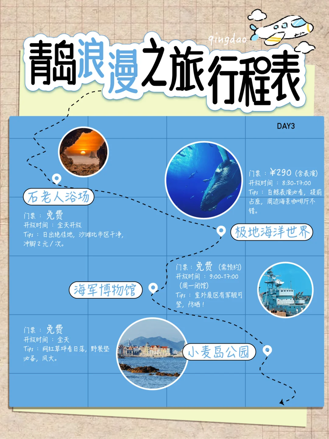 Day3️⃣:石老人浴场→极地海洋世界→海军博物馆→小麦岛公园