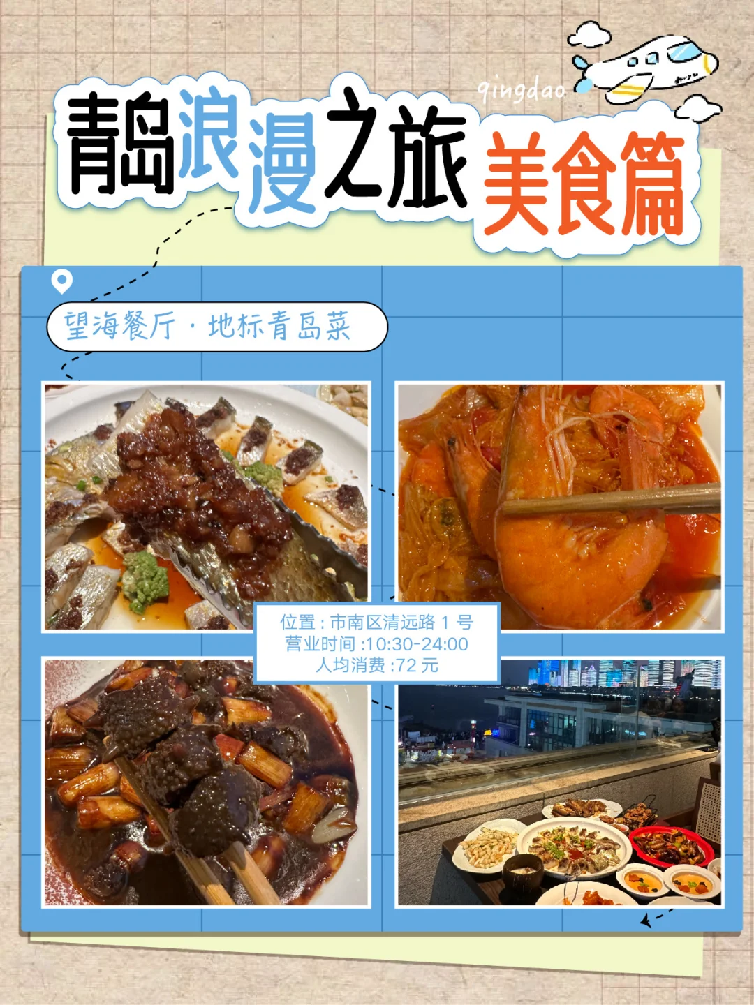📍望海餐厅:青岛地标海鲜、可以在海景餐厅看灯光秀,10:30 - 24:00营业。