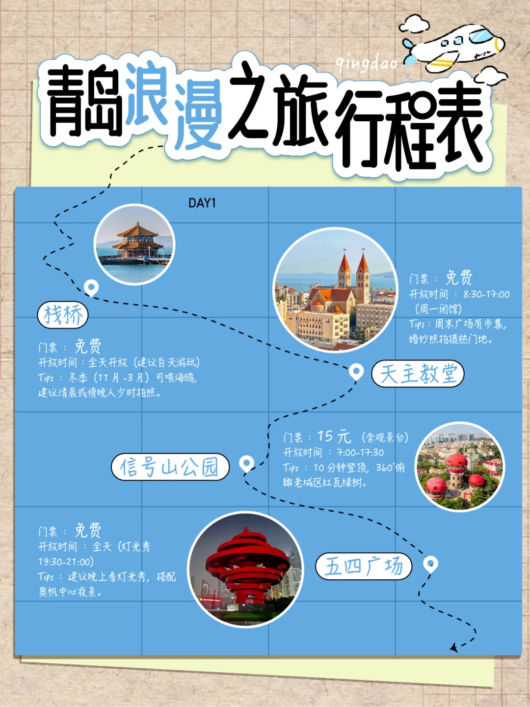 Day1️⃣:栈桥→天主教堂→信号山公园→五四广场