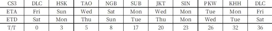 挂靠港口:DLC-HSK-TAO-NGB-SUB-JKT-SIN-PKW-KHH-DLC
