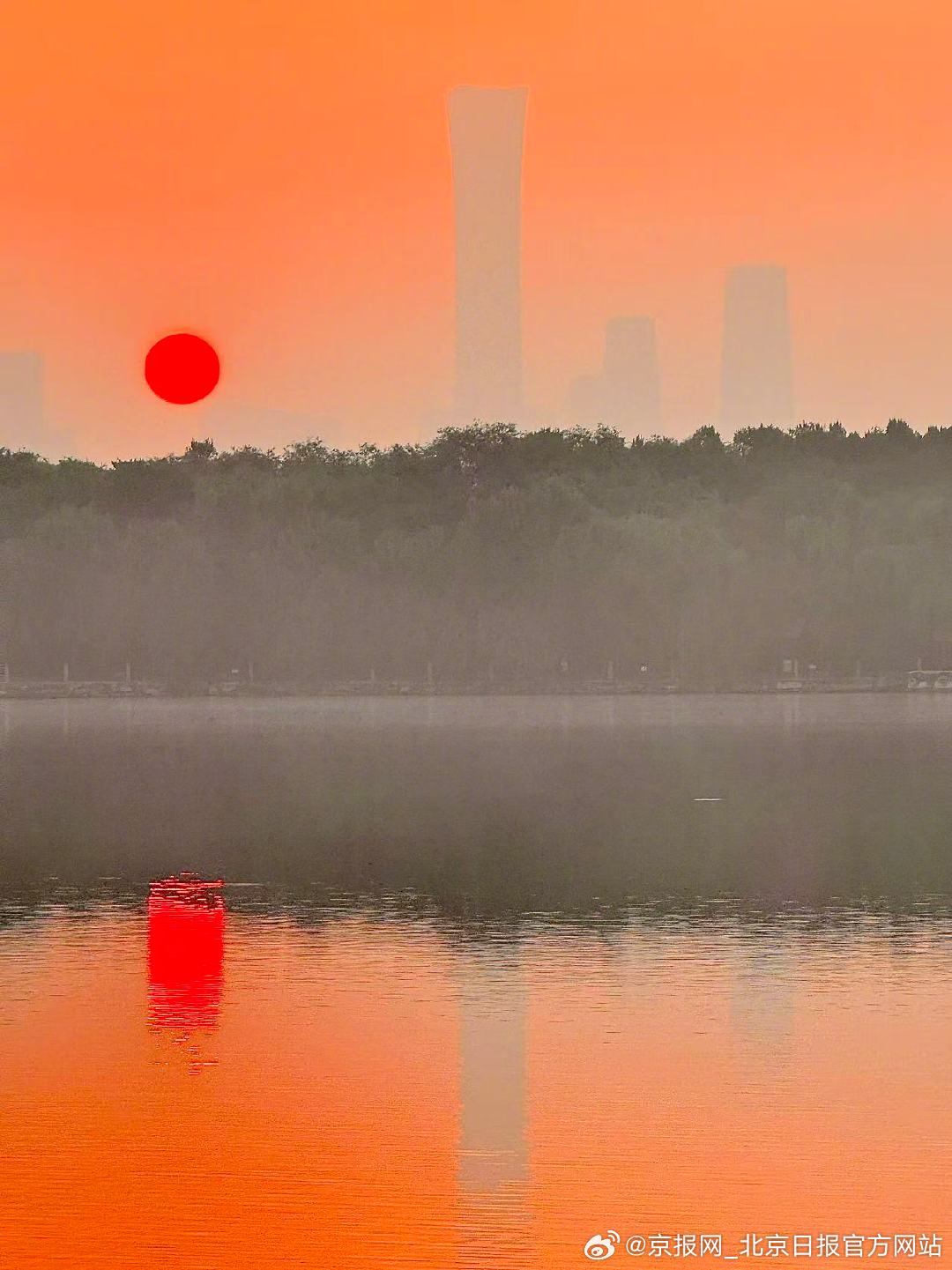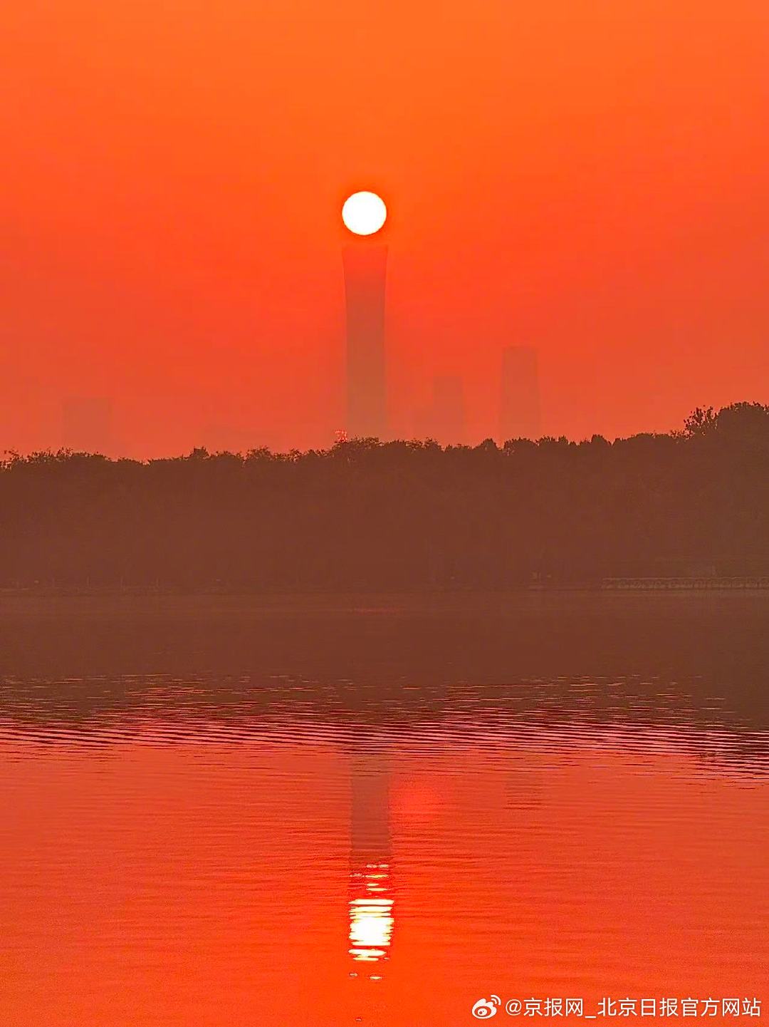 【好暖!#北京日出请您喝杯热红茶#】#今天北京真好看# 10月14日清晨,北京的日出带着温柔暖意而来!天空晕开暖融融的橙红,像刚沏好、还冒着氤氲热气的红茶。暖色调仿佛带着红茶的醇厚香气,水面如镜面,把这 “红茶” 的暖与亮都悠悠映在其上,看得人心里都暖暖的。(作者 王建忠 温红征 武辉 洪华中)