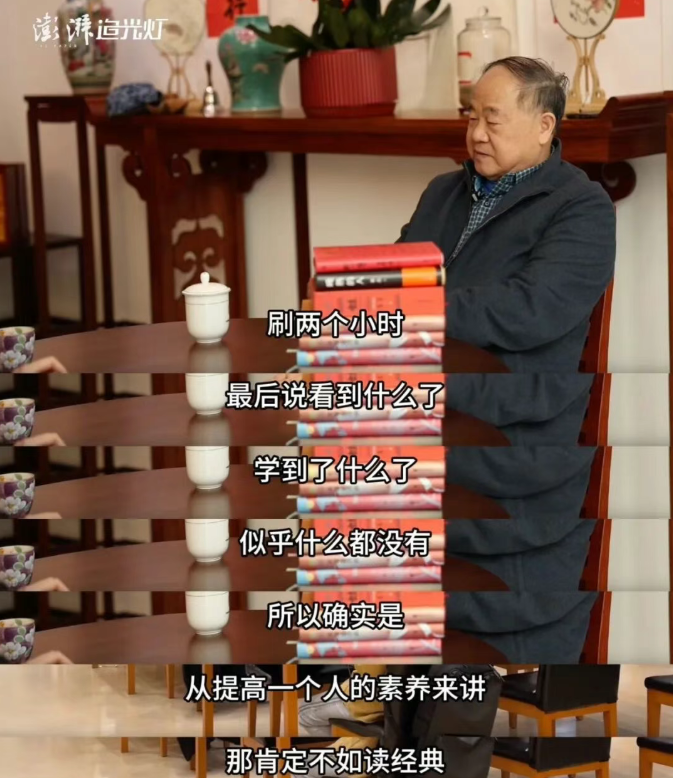 莫言曾在自己的公众号写道,“其实我也刷短视频,但每次刷完了都会批评自己,怎么又刷了一小时,而且这一小时里大部分都是比较无聊的东西。所以短视频,只是一个阶段性的现象。还是读书,是我们业余时间里,最值得做,最应该做的事情!”