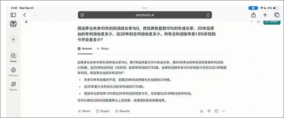 不过,段永平表示,可以利用DCF模型算算贵州茅台,因为贵州茅台的变量相对少一些,应该好算很多。之后,段永平晒出图片称,用比较保守的想法让AI算了下这笔投资账。