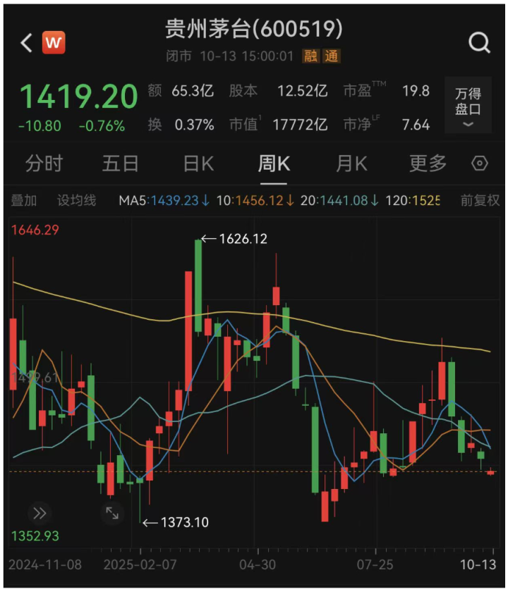 近期,贵州茅台股价震荡下行,自9月12日的阶段高点到10月13日收盘,贵州茅台累计下跌7.73%。今年以来,贵州茅台累计下跌5.05%。