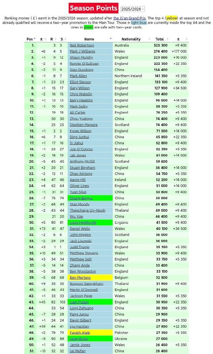 斯诺克:2025西安大奖赛赛后最新世界排名+单赛季排名 世界排名: 北京时间10月13日,威廉姆斯西安大奖赛夺冠,凭借在西安创造纪录的方式夺冠,威廉姆斯收获17.7万英镑冠军奖金,排名提升到第4位,反超奥沙利文。距离世界第三罗伯逊还有7万英镑的差距。 特鲁姆普虽然扣掉同期武汉赛冠军奖金,仍然稳居世界第一。威尔逊仍然第二。奥沙利文第五,希金斯第六。打进8强的丁俊晖提升一位,来到第七。墨菲凭借7.6万英镑亚军奖金,排名提升三位,来到第9位。 塞尔比第10,肖国栋第11,赵心童下滑一位到第12,双双无缘利雅得锦标赛。 张安达第14,极大概率将在国锦赛后跌出前16。加里威尔逊上升到第15位,重返前16。斯佳辉下滑到第17位,这是他在首次打进前16后,首次跌出这一顶级阵容。 单赛季排名: 凭借17.7万英镑冠军奖金,威廉姆斯的单赛季排名提升到第2位。背靠背打进决赛的墨菲上升到赛季第3。奥沙利文第4。罗伯逊凭借沙特赛巨分稳居第一。肖国栋第五。