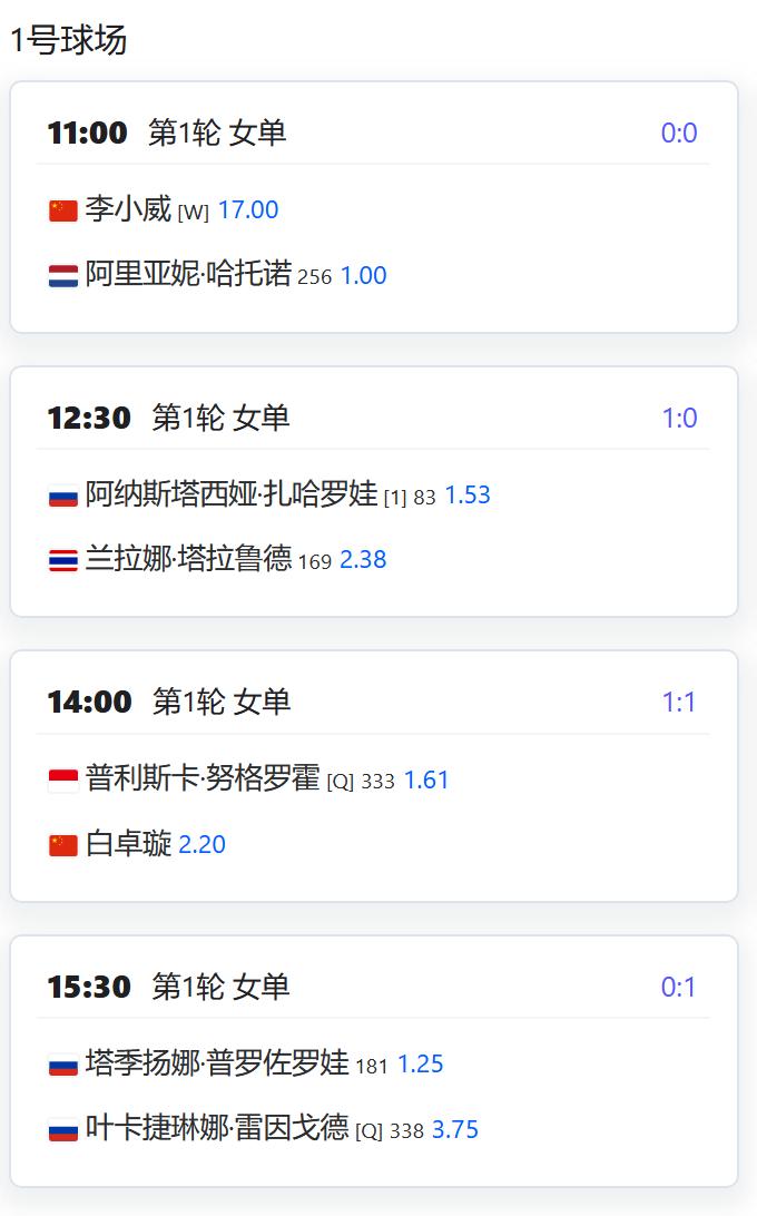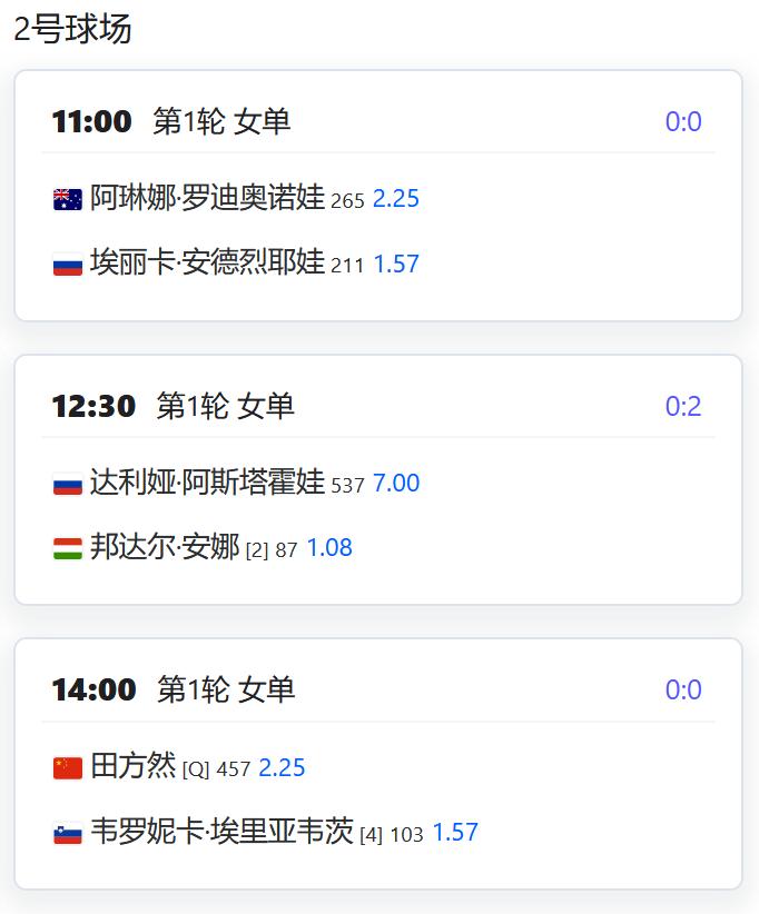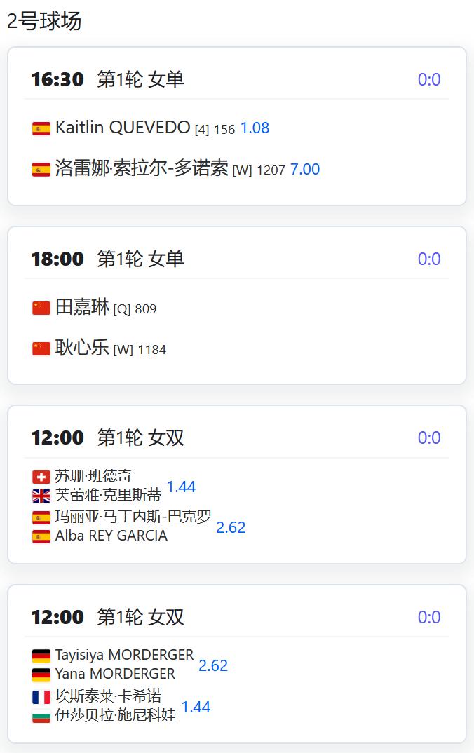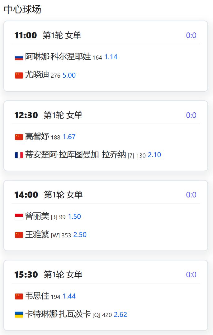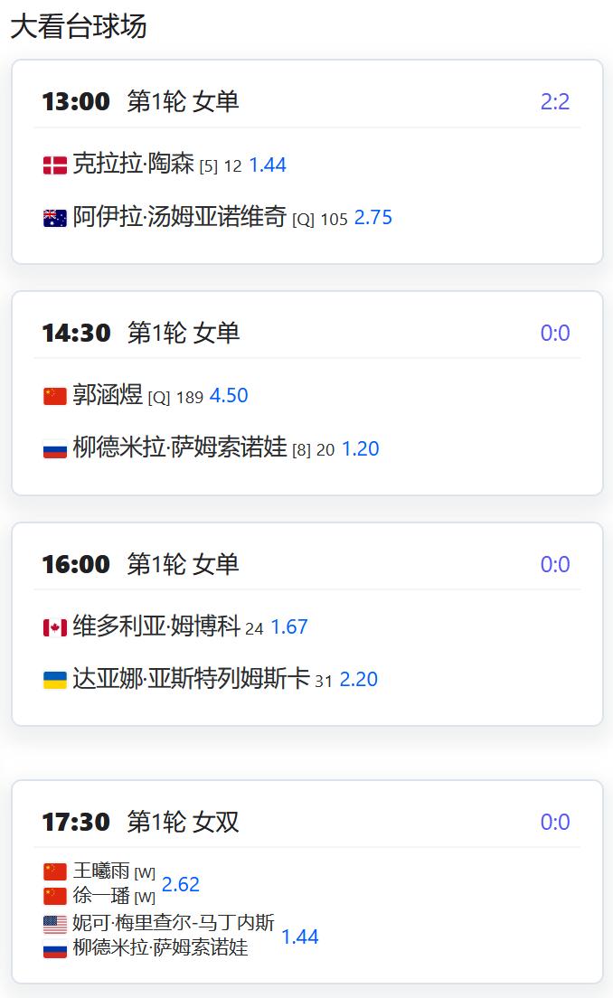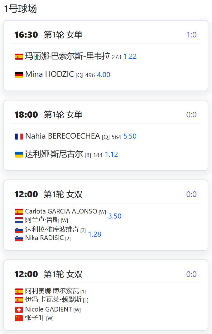 今日赛程: WTA500赛宁波站,女单第一轮,持外卡参赛的张帅将对阵库德梅托娃; 朱琳将对阵英国名将拉杜卡努; 袁悦与王欣瑜将上演中国德比; 从资格赛突围的郭涵煜将对阵8号种子萨姆索诺娃; 女双第一轮,王曦雨/徐一璠将对阵梅里查尔/萨姆索诺娃; W125济南,女单第一轮,尤晓迪将对阵科尔涅耶娃; 高馨妤将对阵7号种子拉乔纳; 王雅繁将对阵3号种子曾丽美; 韦思佳对阵资格赛球员扎瓦茨卡; 持外卡参赛的小将李小威将对阵哈托诺; 复出的白卓璇将对阵资格赛球员努格罗霍; 从资格赛突围的田方然将对阵4号种子埃里亚韦茨; 女双第一轮,李宗钰/李羽芸将对阵叶秋语/碧布差; 施晗/任钰菲将对阵2号种子卓宜岑/卓宜萱; 郑妩双搭档印度的博萨莱对阵卡辛采娃/奥西格威; W100梅肯,女单资格赛第二轮,徐诗霖将对阵4号种子奥库托伊; W100 Les Franqueses Del VallÈs,女单第一轮,从资格赛突围的田嘉琳将对阵持外卡参赛的耿心乐; 女双第一轮,张子叶搭档加迪恩对阵头号种子西班牙组合博尔索瓦/赖默斯; CH75深圳,男单第一轮,周意将对从资格赛突围的王晓飞; 从资格赛突围的莫业聪将对阵苏丹诺夫; 王傲然将对阵7号种子清水悠太; 孙发京将对阵4号种子库伯勒。