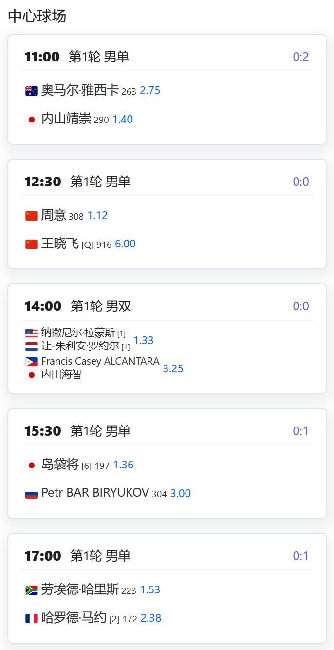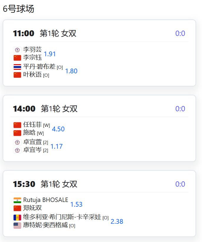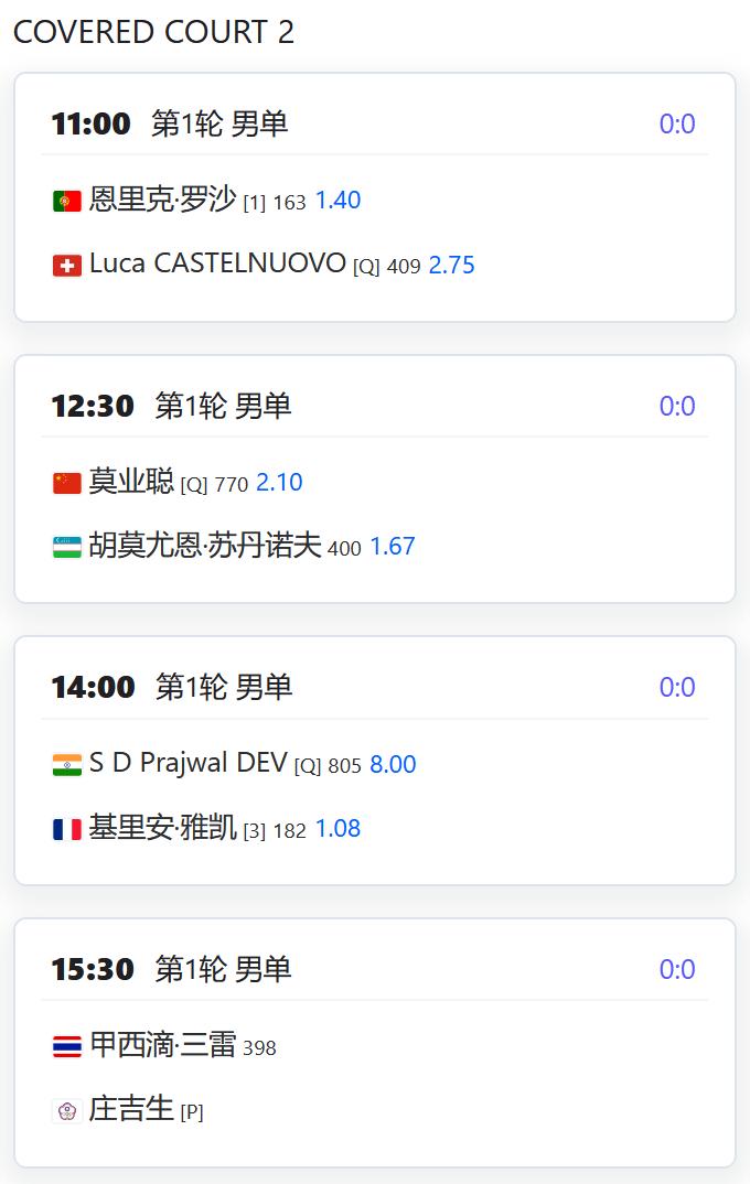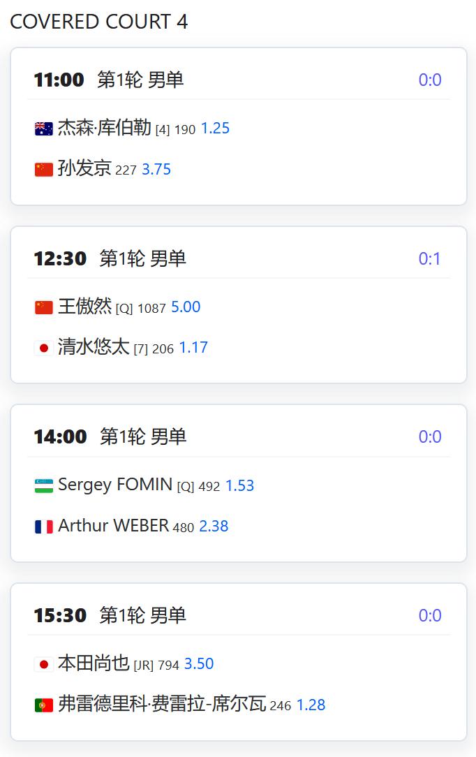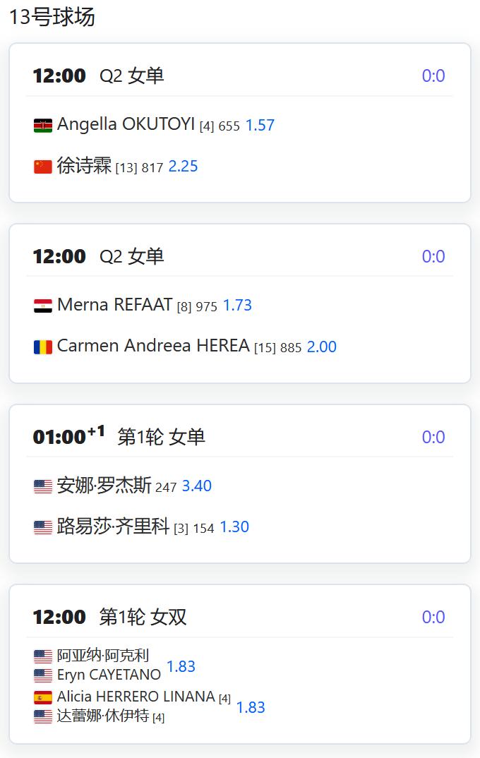 今日赛程: WTA500赛宁波站,女单第一轮,持外卡参赛的张帅将对阵库德梅托娃; 朱琳将对阵英国名将拉杜卡努; 袁悦与王欣瑜将上演中国德比; 从资格赛突围的郭涵煜将对阵8号种子萨姆索诺娃; 女双第一轮,王曦雨/徐一璠将对阵梅里查尔/萨姆索诺娃; W125济南,女单第一轮,尤晓迪将对阵科尔涅耶娃; 高馨妤将对阵7号种子拉乔纳; 王雅繁将对阵3号种子曾丽美; 韦思佳对阵资格赛球员扎瓦茨卡; 持外卡参赛的小将李小威将对阵哈托诺; 复出的白卓璇将对阵资格赛球员努格罗霍; 从资格赛突围的田方然将对阵4号种子埃里亚韦茨; 女双第一轮,李宗钰/李羽芸将对阵叶秋语/碧布差; 施晗/任钰菲将对阵2号种子卓宜岑/卓宜萱; 郑妩双搭档印度的博萨莱对阵卡辛采娃/奥西格威; W100梅肯,女单资格赛第二轮,徐诗霖将对阵4号种子奥库托伊; W100 Les Franqueses Del VallÈs,女单第一轮,从资格赛突围的田嘉琳将对阵持外卡参赛的耿心乐; 女双第一轮,张子叶搭档加迪恩对阵头号种子西班牙组合博尔索瓦/赖默斯; CH75深圳,男单第一轮,周意将对从资格赛突围的王晓飞; 从资格赛突围的莫业聪将对阵苏丹诺夫; 王傲然将对阵7号种子清水悠太; 孙发京将对阵4号种子库伯勒。