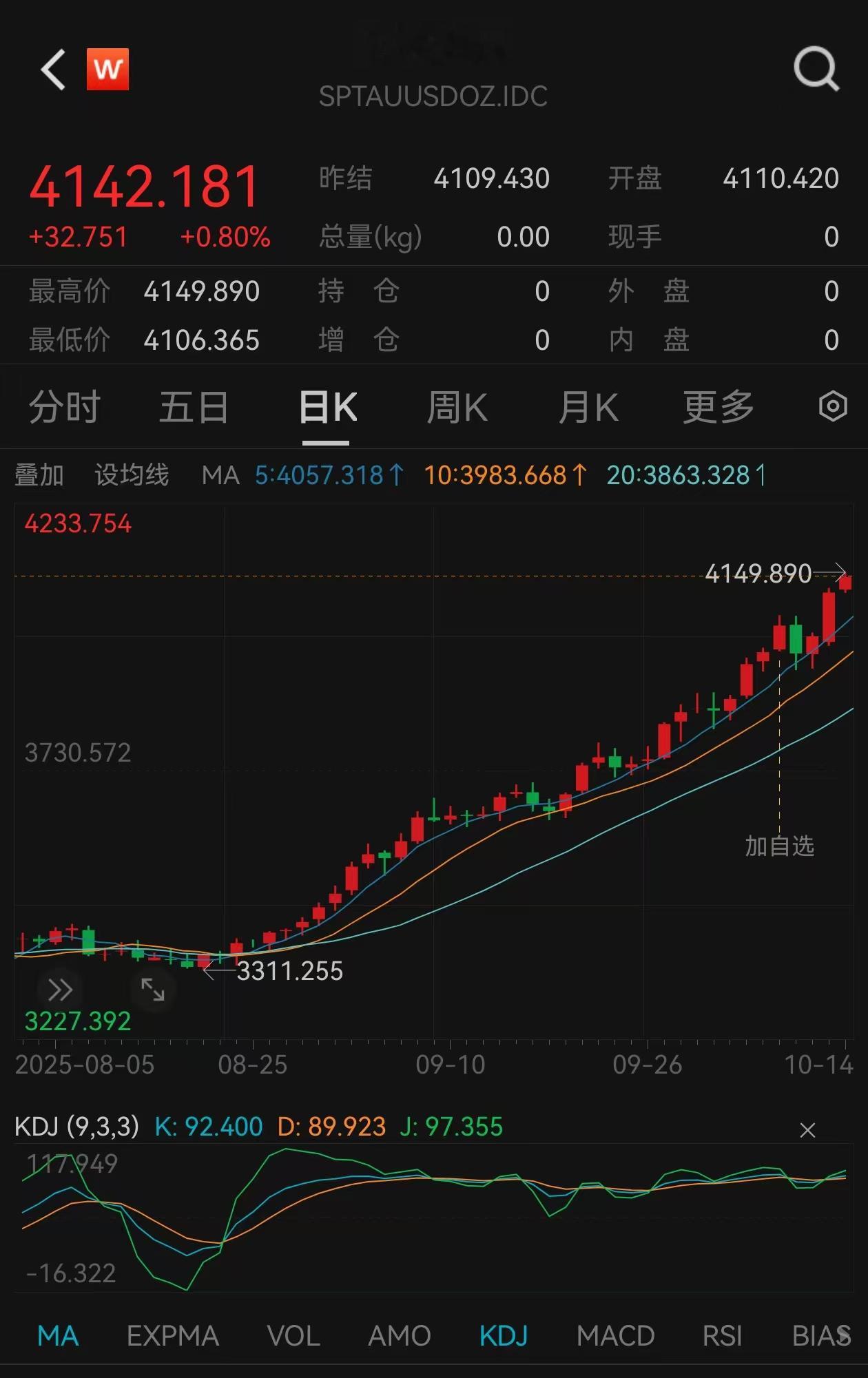 消息面上,国际金价再度攀升。Wind数据显示,截至10月14日上午9点35分,伦敦现货黄金盘中最高价为4149.89美元/盎司;COMEX(纽约商品交易所)黄金期货盘中最高价为4160美元/盎司,均又一次刷新历史纪录。