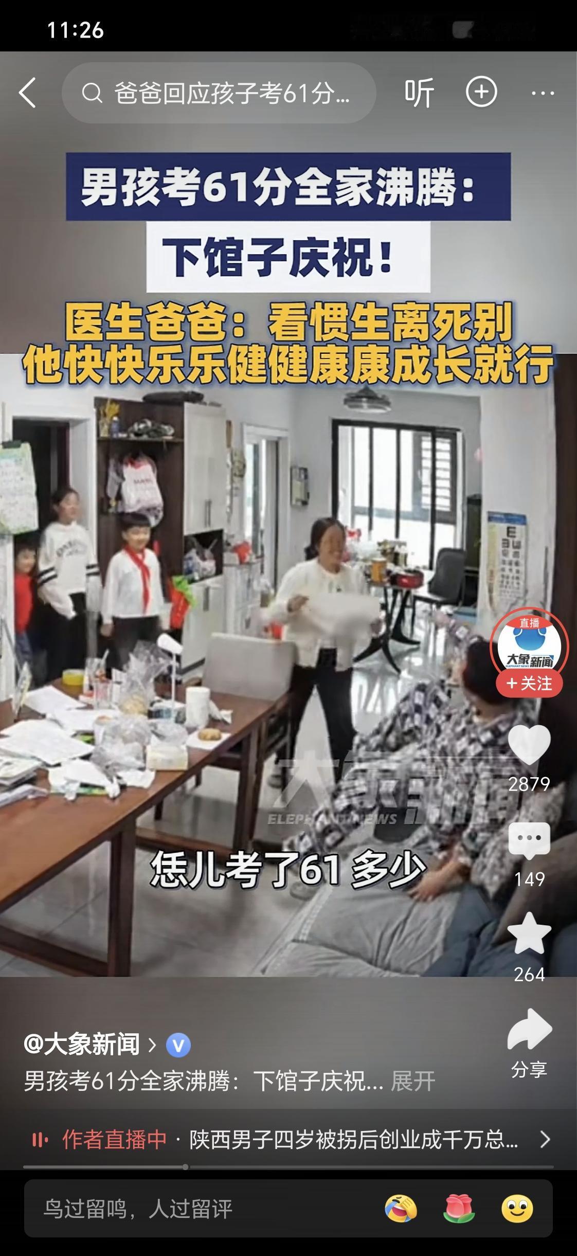 一小孩考试61分,刚及格,全家沸腾了,氛围十足,家长奖励下餐馆吃饭! [笑哭]佛系的医生爸爸看过了太多生老病死,看透了人生,人生百年,下辈子不一定还能成为亲人,基本上也不会强逼他的娃,不内卷他的娃,让他的娃健康活着就好! 说实在话,也就是因为这个家长是医生的职业,刚好他的养育方式叫散养,随便养,他的亲子关系才会如此放松。 医生的职责是救死扶伤!没有什么可以贵过生命本身! 小孩子因为投胎到这样的家庭中,在爱与自由中成长,性格与大自然的顺其自然浑然天成了! 未来无限可能。 这个娃注定是乐天派,不消耗的娃! 这样的特别的家长是百年都难得一遇的! 祝福,祝福!