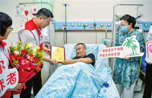 10月13日,在海南省妇女儿童医学中心造血干细胞采集室,海口出入境边防检查总站民警小何接受省红十字会颁发荣誉证书。记者苏弼坤摄