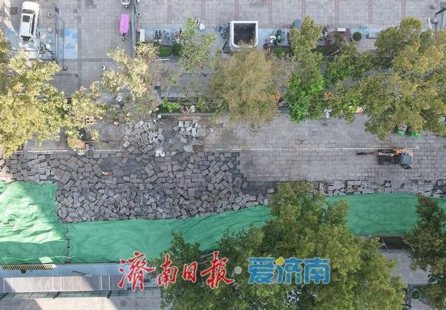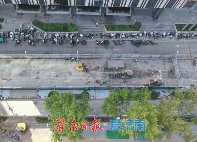 10月14日,记者在现场发现,济南泉城路(县西巷—黑虎泉西路)已经被围挡封闭,施工人员在封闭区域内开始对机动车道和北半幅人行道进行提升改造。