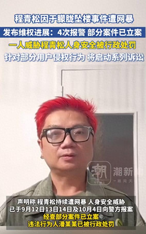 声明称,程青松持续遭网暴,人身安全威胁,已于9月12日13日14日及10月4日向警方报案,经查部分案件已立案,违法行为人潘某某已被行政处罚。