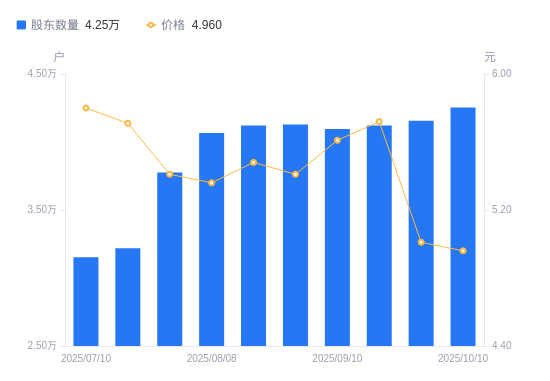 日期A股户数(户)流通A股户均持股数(股)户均持股市值(万元)2025-10-104254325318.2212.562025-09-304155625919.5612.992025-09-194121526134.0114.952025-09-104095626299.2814.752025-08-294129426084.0114.112025-08-204122026130.8414.322025-08-084066626486.8214.202025-07-313775428529.7815.432025-07-183218633465.2719.112025-07-103152734164.7919.82