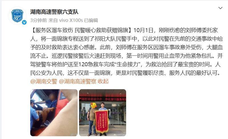 安全感拉满 @湖南高速警察六支队 祁阳大队暖心帮助受伤驾驶人,收获一面锦旗