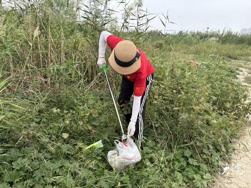 池州城西白洋河是流经池州主城区的一条“护城河”。随着政策放开,今年夏季以来,来此钓鱼者渐多。今年6月份以后,每天傍晚时分,许胜宝都会准时出现在城西白洋河河岸附近,只见她手持垃圾钳,弯腰探身,将地面的塑料袋、草丛中的饮料瓶以及散落一地的鱼饵包装袋一一夹起,动作利落。日复一日,这几乎成了她每天傍晚的“日常工作”。