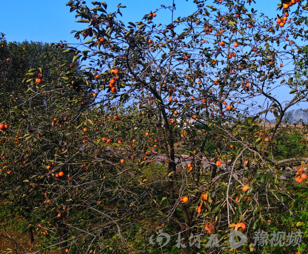 眼下正值深秋时节,在周口市沙河畔,连片种植的数百棵柿子树硕果累累,一个个成熟的柿子像一盏盏橘红的灯笼挂满枝头,成为一道亮丽的风景。