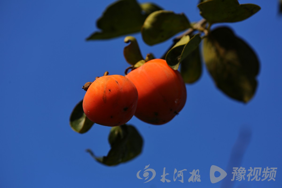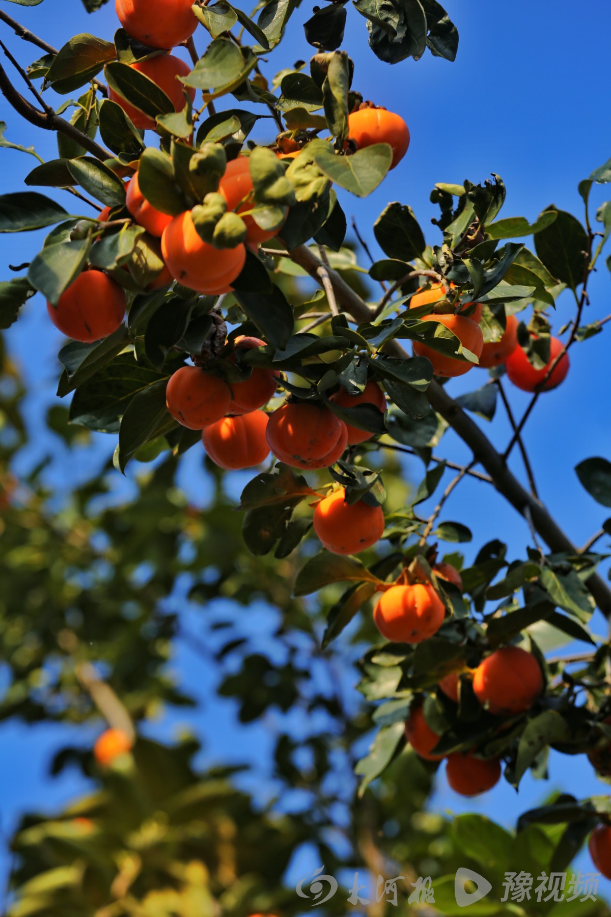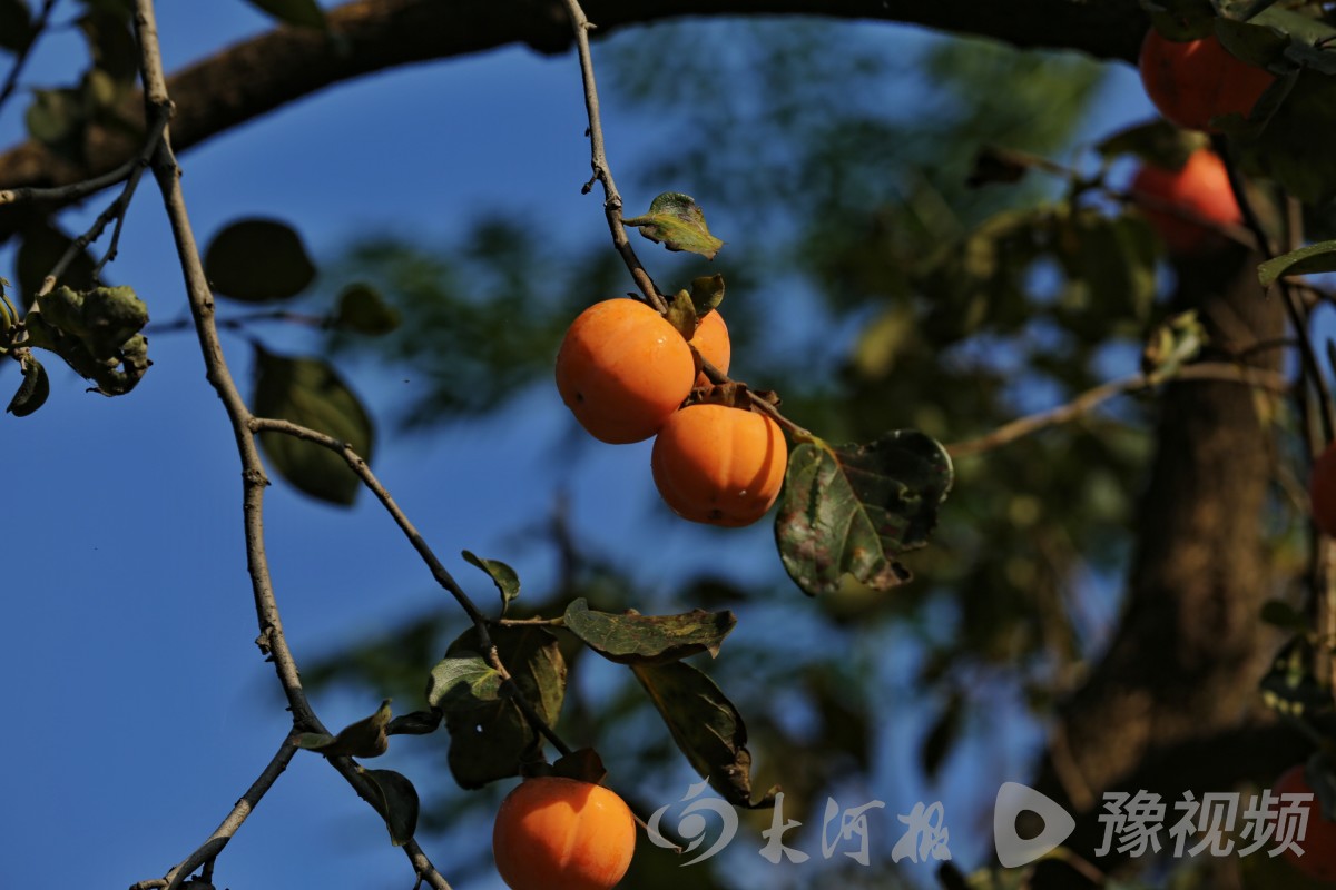 10月14日上午,大河报·豫视频记者来到沙河西华县与川汇区交界处的张柿园村附近,远远望去,只见河堤上的柿子树枝叶繁茂,一个个如拳头大小的柿子点缀在枝叶间,吸引着蜜蜂和蝴蝶环绕飞舞。连续的阴雨天停歇后迎来短暂的晴日,红彤彤、黄灿灿的柿子在蓝天映衬下格外醒目,微风拂过,柿香浓郁。