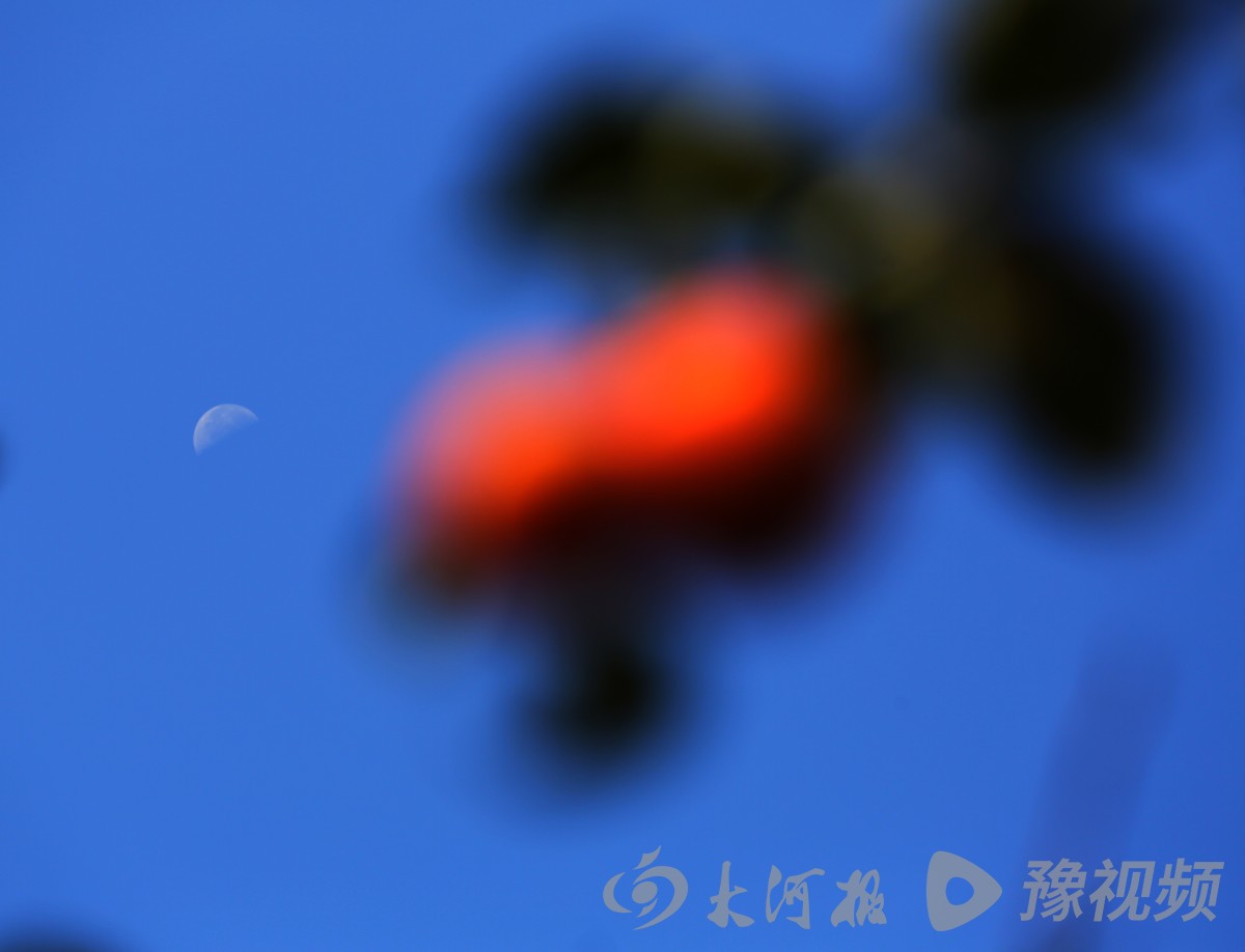 10月14日上午9时许,一弯月牙挂在柿子枝头