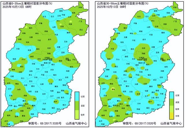 目前我省谷子中南部处于成熟收获期,北部大部区域已收获完成。10月以来,我省气雨日较多、降水量较大、光照偏少,全省大部分地区累积降水量在50mm以上,日照时数中南部地区在10h以内,降水较多、日照偏少使得全省大部地块土壤过湿,散墒困难,导致谷子穗部湿度过大,易形成霉变、出芽等状况,影响谷子产量和品质。最新土壤墒情监测结果显示,我省土壤墒情表层中部和东南部大部、北部局部土壤过湿,深层全省大部存在土壤过湿现象。