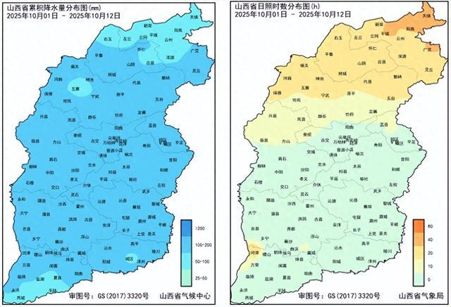 10月1日-12日,平均气温为13.5℃,比历年同期偏高0.9℃,各县(市)介于10.0~17.5℃之间。累计降水量为138.5mm,比历年同期偏多118.3mm,各县(市)降水量介于51.4~213.3mm之间。累计日照时数为11.3小时,比历年同期偏少58.5小时,各县(市)日照时数介于0.2~44.9小时之间。