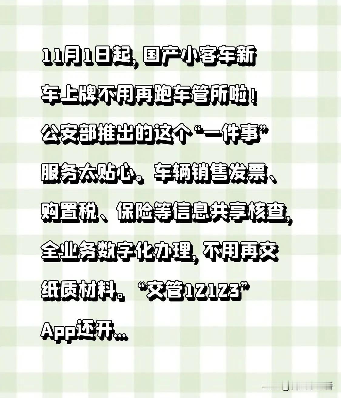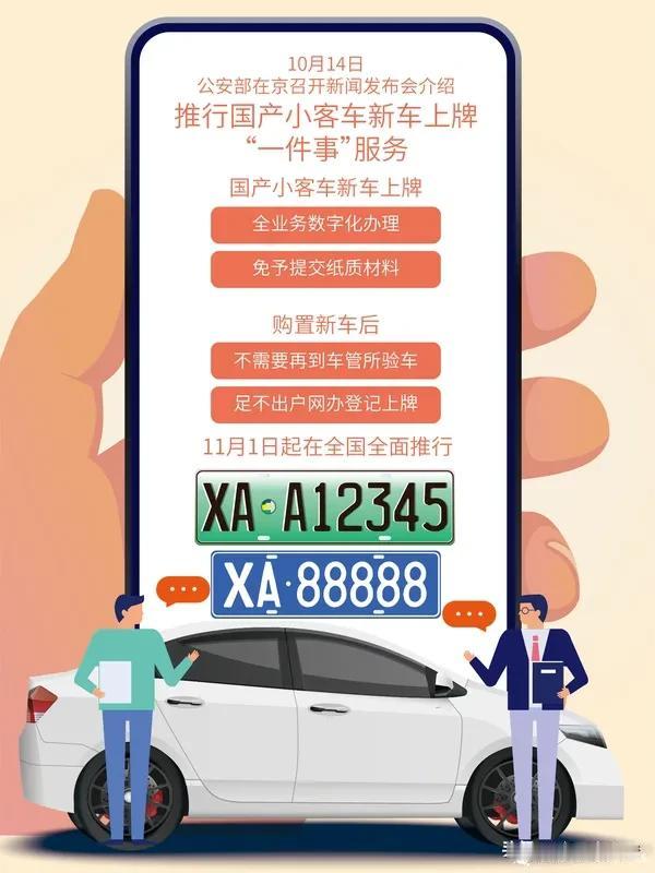 11月1日起,国产小客车新车上牌不用再跑车管所啦!公安部推出的这个“一件事”服务太贴心。车辆销售发票、购置税、保险等信息共享核查,全业务数字化办理,不用再交纸质材料。 “交管12123”App还开发了新车上牌模块,集成选车、购险链接和选号、上牌等服务。新车信息联网共享,买了新车也不用去车管所验车,在家就能登记上牌。这次公安部还实施7项“高效办成一件事”改革措施,以后办事更方便,给这波操作点赞!