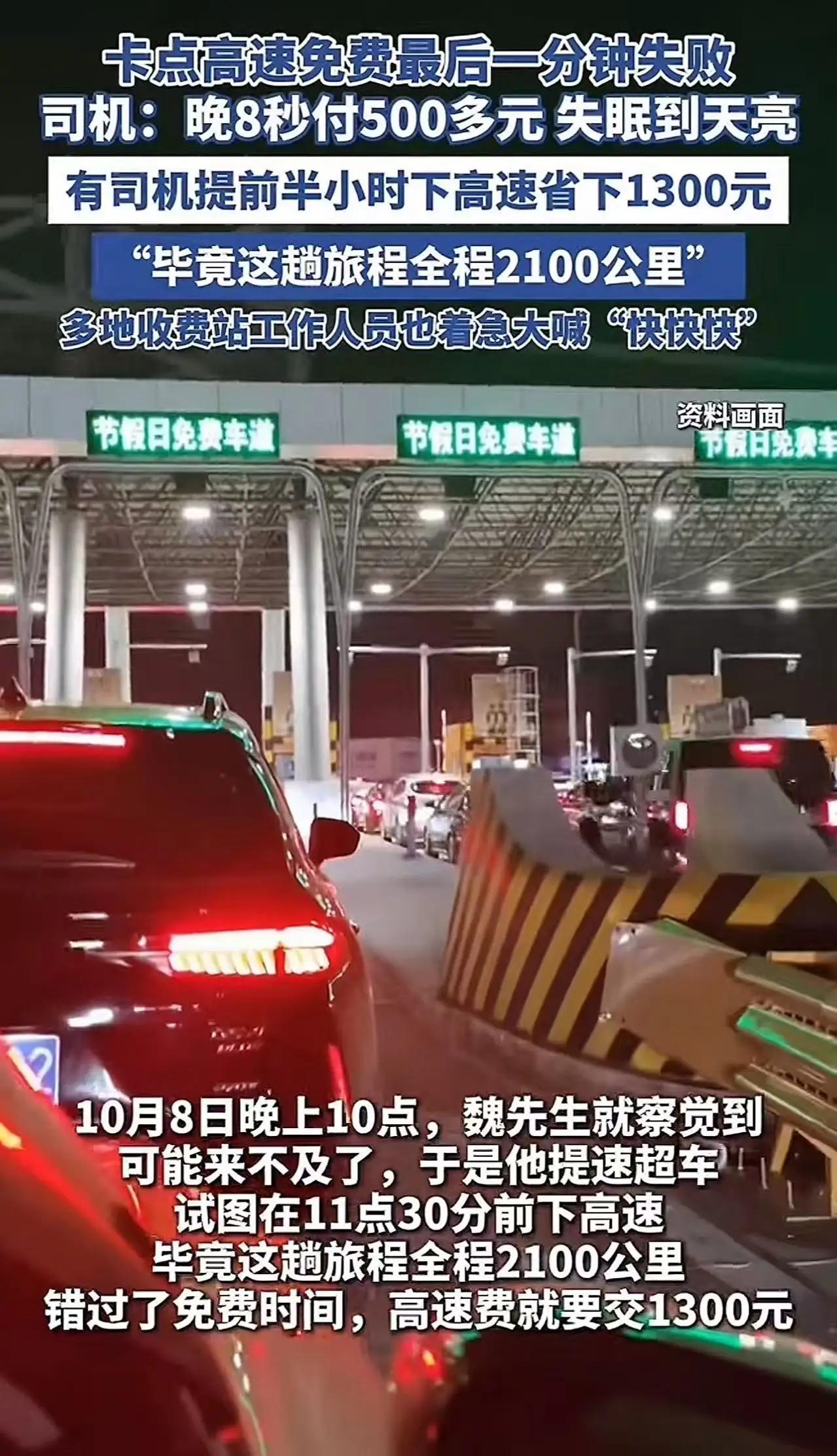 国庆icon高速免费最后一分钟,男子晚8秒付款500多,失眠到天亮!男子:“2天工资没了,心疼了一宿没睡着!”网友:一看就是没经验!不会提前下高速再上吗? 国庆假期的最后一分钟,成为了许多人心头的“悬念”。就在大家以为“最后冲刺”已经过去,车流逐渐散去的时候,他的故事却让人忍不住心头一紧。男子在高速免费政策的“倒计时”中,拼尽全力冲刺,却在最后8秒时才完成付款,结果多花了500多元。这一幕,仿佛是一场“时间与金钱的较量”,也折射出不少司机在节假日出行中的“心态战”。 他坦言:“2天工资没了,心疼了一宿没睡着。”简单一句话,却透露出太多无奈与焦虑。假期本是放松的时光,却因为一场“错失的抢票战”变得如此沉重。有人说,这只是一次普通的支付失误,但细细想来,却映照出我们在面对突发情况时的“应变能力”。是不是每个人都曾在关键时刻“手忙脚乱”?是不是每次“最后一秒”都隐藏着我们对时间的焦虑和对金钱的敏感? 而网友们的评论也五花八门:“一看就是没经验!不会提前下高速再上吗?”这句话似乎在提醒我们:面对突如其来的优惠或政策,提前准备、合理规划才是王道。毕竟,节假日的高速免费,像是一场“时间的赌局”,你不提前布局,就可能输在最后一秒。 然而,细想一下,这个故事背后隐藏的,是我们每个人都曾经历过的“人生的缩影”。在快节奏的社会中,谁不曾因为一时疏忽而付出“代价”?谁不曾在最后一刻拼尽全力,只为了那一点点“剩余的时间”或“优惠的利益”?这不只是一次高速收费的教训,更是一次关于“提前规划”和“心态调整”的人生启示。 我们或许都曾在生活的“倒计时”中慌乱,但正是这些“失误”让我们学会了更理智、更从容。毕竟,人生没有“最后一分钟”,只有“每一分钟都值得用心去把握”。这位男子的故事,提醒我们:别让“最后一秒”成为人生的遗憾。提前准备,冷静应对,才是赢得人生“优惠券”的真正秘诀。 所以,下次面对类似的“倒计时”时,你会不会像他一样,学会提前布局?或者,你会选择在关键时刻保持冷静,不让“时间的洪流”带走你的每一份努力?答案,也许就藏在我们每个人的选择里。国庆高速现状 高速免费时间