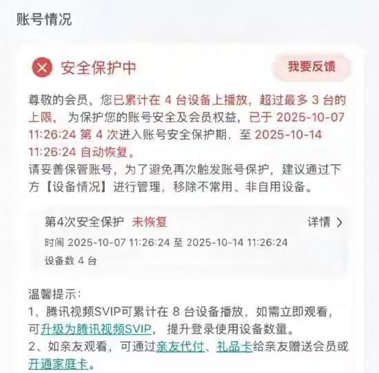 腾讯视频VIP登录设备超3台被封号7天!知情人士说是为防止黑灰产,这也是影视行业的通用规则。 腾讯视频这波操作真的太败好感,防黑灰产的大旗别成了“逼用户升级”的幌子! 平台说怕账号租赁、盗版才设的限制,可普通家庭哪经得起这么多卡?手机、平板、电视再加上偶尔来的父母用,分分钟就超过3台上限。 更气人的是,封了7天不仅不退这几天的会员费,手动解封还就给2次机会,用完想立马看?只能花钱继续升SVIP。 明明技术能分清家庭共享和商业黑灰产,非要用“一刀切”的数量限制,这哪是保护账号,更像在逼着用户多掏钱。 说是行业通用规则,但我们用户付了费,连正常家庭使用都要小心翼翼的,实在是说不过去。 你们家的视频会员会不够设备用吗?遇到这种封号,你是会等解封还是被迫升级?
