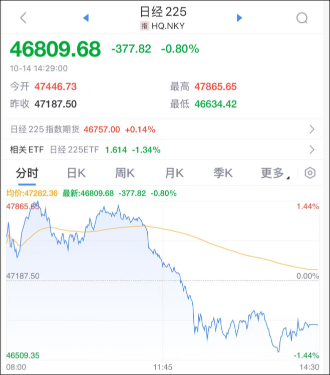 今天市场突然大变脸,不仅A股,黄金、日经指数、美股三大股指期货、加密市场,全部大跳水!一起看看发生了什么事情。全球跳水10月14日午后,全球市场遭遇猛烈抛售。其中,现货黄金从最高点短线急跌超89美元,现报4107美元/盎司。现货白银短线急跌近3美元,现报51.23美元/盎司。