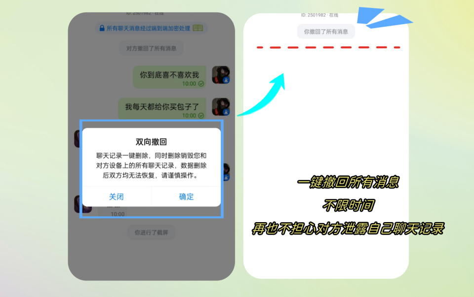 除加密技术外,它们通常还配备多项隐私保护功能,如预设密信、双向消息撤回及截屏提醒等。以“双向撤回”为例,开启后可一键清除所有聊天记录,即便超过60分钟的消息也能彻底撤回。