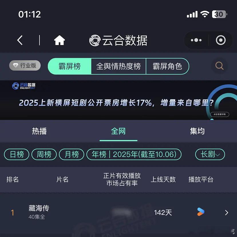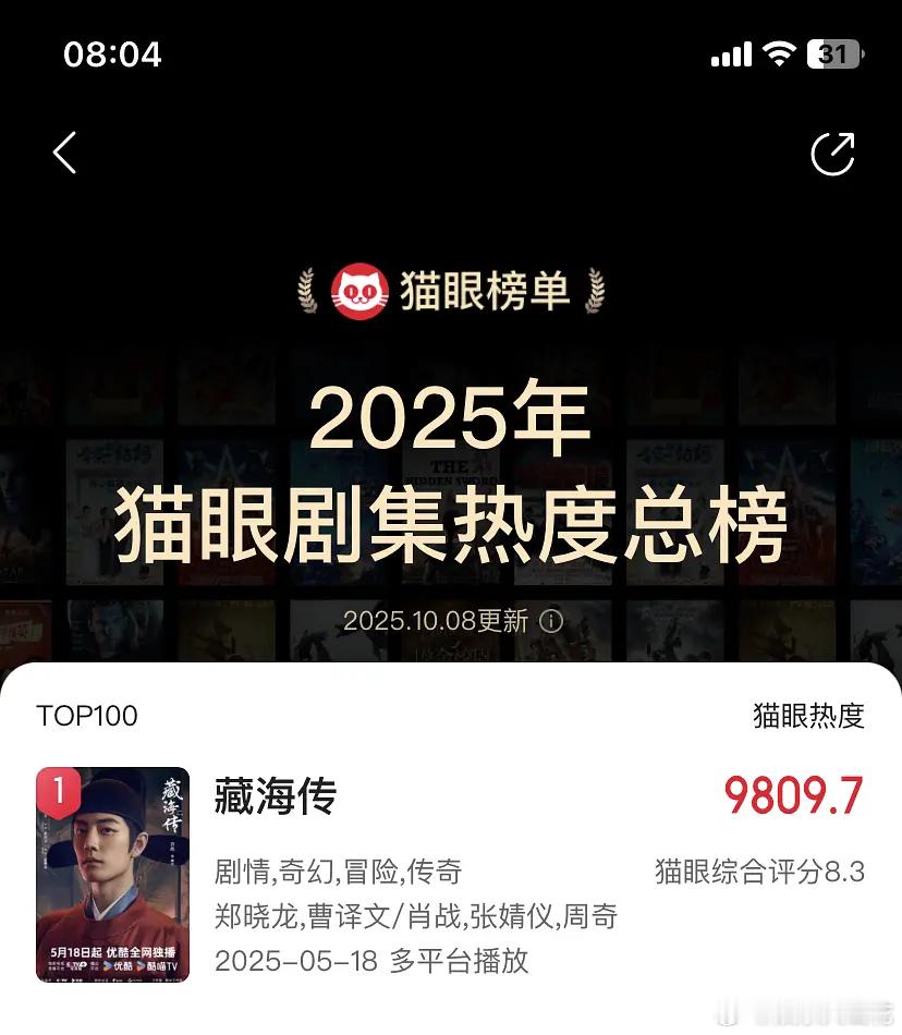 好多第一!藏海传猫眼热度总榜暂2025年第一☝️,有效总播放量暂2025年第一☝