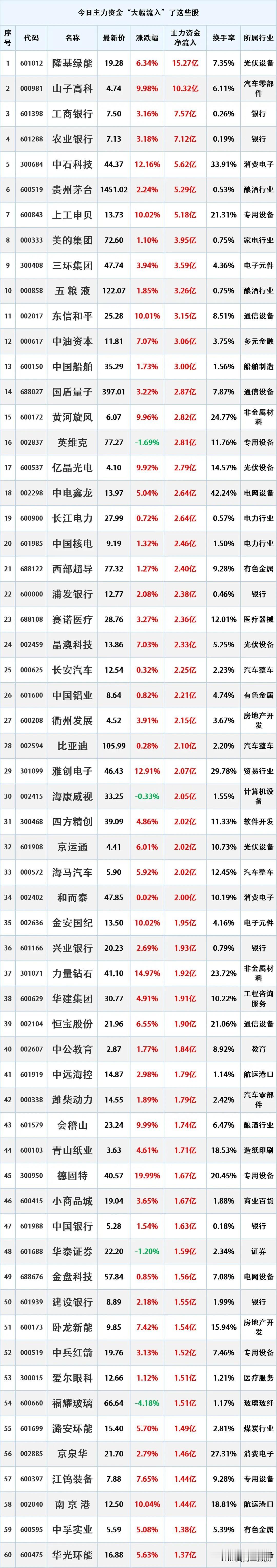 尾盘跑步入场,10月14日主力资金大幅流入的股票名单。 资金流入是指在一定时期内(如一天、一周等),主动买入某只股票的资金量大于主动卖出该股票的资金量。主动买入是指投资者以卖方的报价直接成交,显示出投资者对该股票的积极购买意愿。
