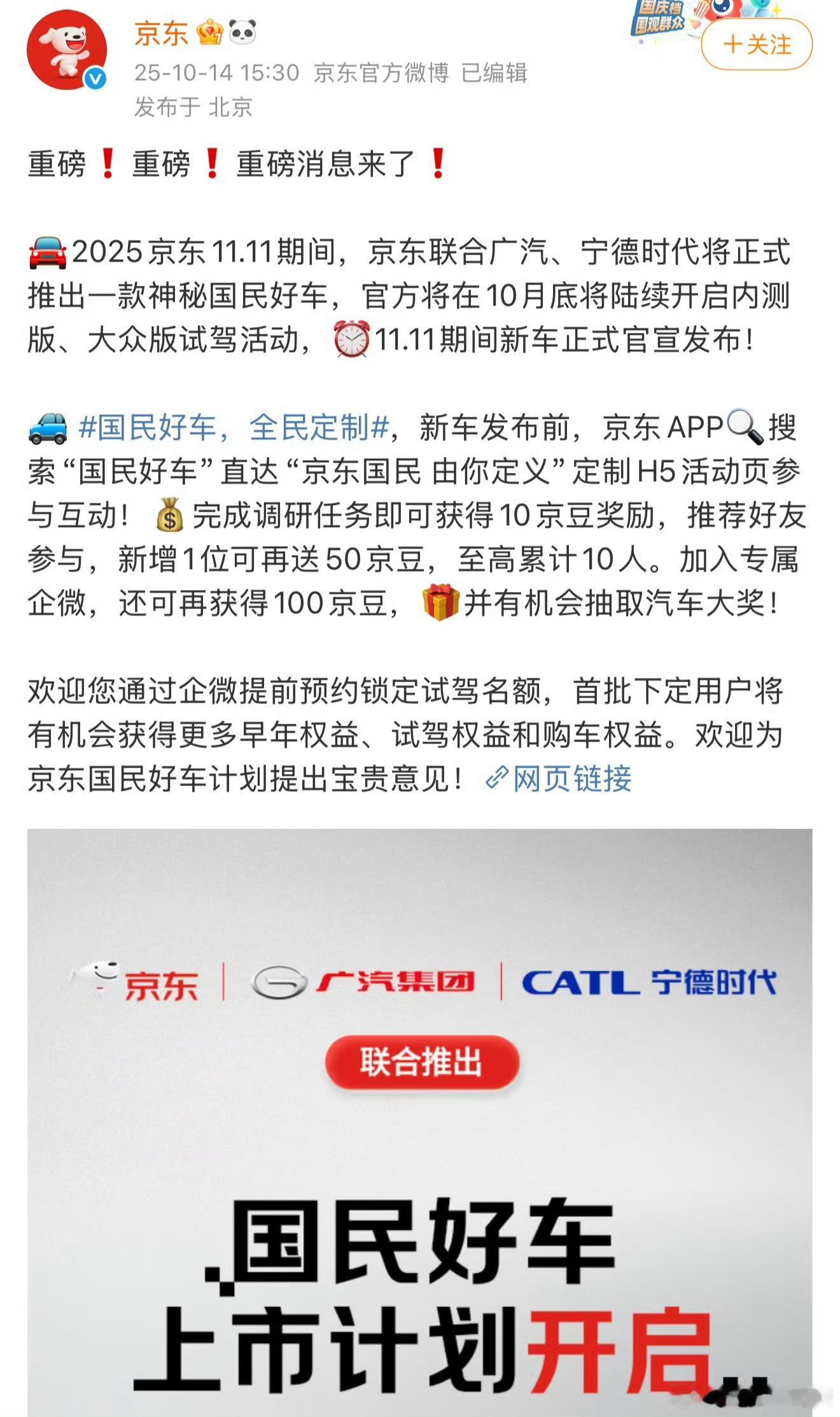 京东汽车京东、广汽、宁德时代联合造车,瞄准15-20万元家用市场,裸车价约7-8万元(不含电池),看来也有租电方案,支持换电,适配宁德时代全国超1000座换电站,据说双十一发售,期待吗?