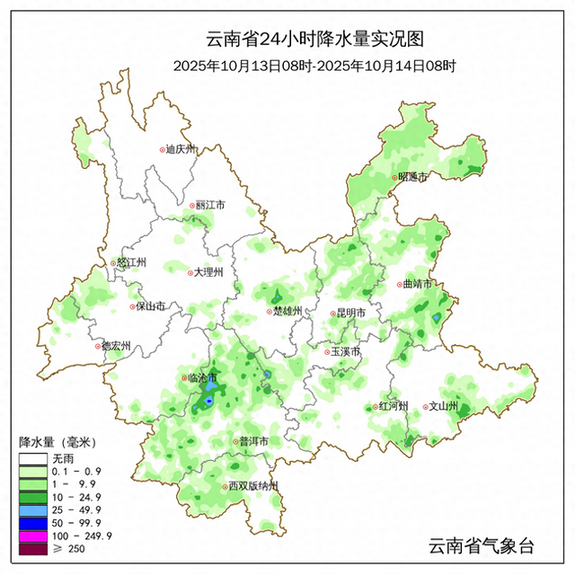 10月13日08时至14日08时,昭通市、曲靖市、文山州南部、红河州东南部和西北部、玉溪市西部、昆明市北部、楚雄州中部、普洱市、西双版纳州、临沧市南部降小雨局部中到大雨、暴雨,其他地区多云间晴。