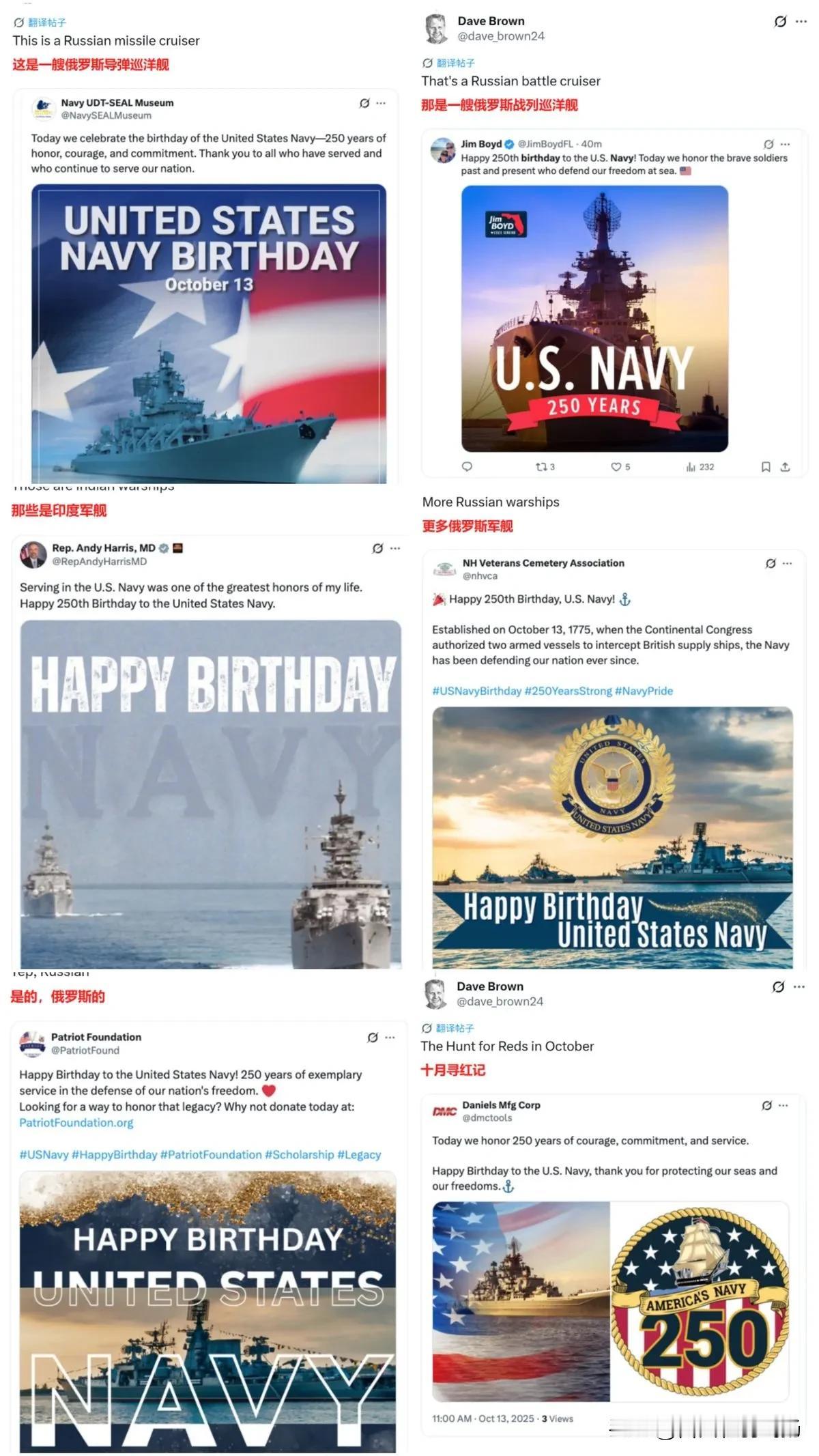 美国海军纪念成立250周年,发了一堆军舰海报,没一个是美国的! 也不知道美国机构和议员们到底是认不清军舰,还是不会用搜索引擎,又或者觉得美国军舰破破烂烂太丢人。 美国海军成立250周年的纪念活动,本该是展示军威的高光时刻,结果却闹了个天大的笑话——一堆美国机构和议员兴冲冲发布的纪念海报里,愣是没一艘军舰是美国的。 这波操作看得全球网友目瞪口呆,是真认不出自家军舰?还是连搜索引擎都不会用?亦或是觉得自家军舰拿不出手?答案至今没人说清,但离谱的事实就摆在眼前。 美国海豹突击队博物馆、退伍军人公墓协会、爱国者基金会这些本该最懂军事的机构,海报上印的竟是好几艘俄罗斯舰艇,深蓝的舰体配着俄式雷达,明眼人一眼就能识破。 更荒唐的还在后头,国防和航天制造商丹尼尔斯公司,作为军工领域的“自己人”,居然用了前苏联的老军舰当素材;佛州共和党候选人、退伍老兵迈克·彼得森,按理说该对军舰了如指掌,结果也跟着踩了坑,海报上的舰艇带着浓浓的冷战时期苏式风格。 最让人哭笑不得的是一众国会议员,众议员安迪·哈里斯、凯尔·多纳休、阿尔文·文卡特、乔希·西格尔等人,齐刷刷用了印度军舰的图片,舰身上的印度海军标识清晰可见,被网友调侃“这是要给印度海军代言吗”。 除此之外,丹麦舰艇、日本舰艇也纷纷“客串”美国海军海报,活脱脱一场国际军舰“大杂烩”。 这些海报可不是随手拍的糊图,个个都经过精心设计,排版工整、配色亮眼,一看就是花了心思的物料。 有网友猜测,说不定是美国海军自己分发的官方素材出了错,否则怎么会有这么多不同机构和个人“集体翻车”?要是一两张弄错,还能说是手滑失误,可这么多重量级角色同时出错,实在让人匪夷所思。 更讽刺的是,就在这场乌龙闹剧上演的同时,“杜鲁门”号航母的窘境被水兵捅了出来。10月5日诺福克海军基地的庆典上,特朗普在航母前发表演说时,身旁巨幅海报恰好遮住了航母2月碰撞受损的部位。 这处“小伤”过去了整整8个月,居然还没修好,表面只多涂了层漆糊弄事。有美国网民翻出历史对比:太平洋战争时,“约克城”号航母被日军击伤后,72小时紧急抢修就重返战场,如今的美国海军修个撞痕要大半年,最后还得靠海报遮丑,这差距简直天差地别。 一边是拿不出手的受损航母,一边是张冠李戴的纪念海报,两件事凑在一起,难免让人联想:是不是美国海军自家舰艇实在没眼看,才只能拿别国军舰充数? 要知道,美国海军向来以“全球最强”自居,麾下11艘核动力航母、数十艘宙斯盾驱逐舰,怎么看都不该缺能上海报的“门面担当”。可现实却是,现役舰艇要么趴窝维修,要么带着伤出勤,连250周年的“大日子”都拿不出一艘完好的明星舰艇撑场面。 外网的嘲讽早已炸开了锅。有美国网友辛辣调侃:“原来我们有这么多人‘通俄’?不然怎么清一色俄罗斯军舰?”还有人吐槽:“议员们连自家军舰都认不出,还指望他们管好海军?” 更有网友直指要害:“海报用错只是表面,修不好航母才是真丢人,这250周年庆,庆的是啥?庆乌龙还是庆无能?”这些质疑戳中了痛点——一个连自家装备都搞不清楚、连基础维修都拖拖拉拉的海军,所谓的“强大”或许早已名不副实。 这场闹剧给所有国家提了个醒:真正的实力从不在海报上,而在实打实的装备维护、人员素养和专业精神里。美国海军250周年的纪念,本该是回顾荣光、提振士气的契机,最终却因一场低级乌龙和遮丑海报沦为笑柄。 那些错把俄舰、印舰当自家宝贝的机构和议员,丢的不仅是自己的脸,更是美国海军的颜面。海报可以换,遮丑的纸却包不住火。美国海军要想找回体面,与其在海报上做文章,不如先把受损的航母修好,先让相关人员认清楚自家的军舰。 否则,下次再办庆典,说不定就得用别国航母当素材了。美国军舰 美国海军衰落