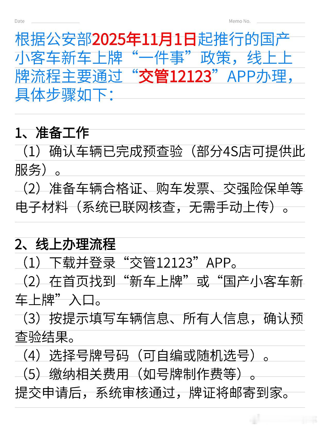 根据公安部2025年11月1日起推行的国产小客车新车上牌“一件事”政策,线上上牌流程主要通过“交管12123”APP办理,具体步骤如下: