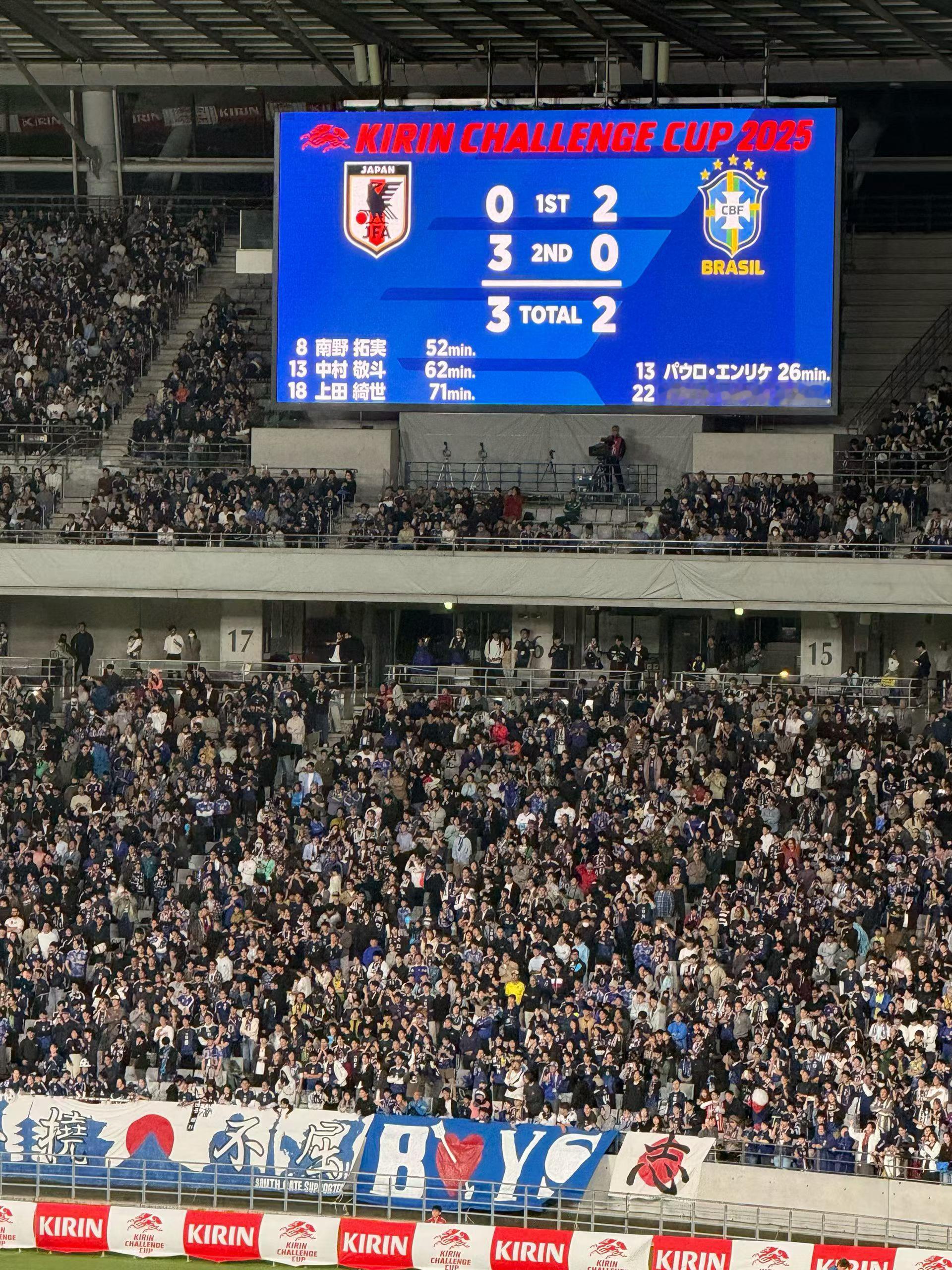 日本3比2战胜巴西队比赛现场来了四万多观众。在现场的朋友说,东京味之素球场已经很久没有坐过这么满了。