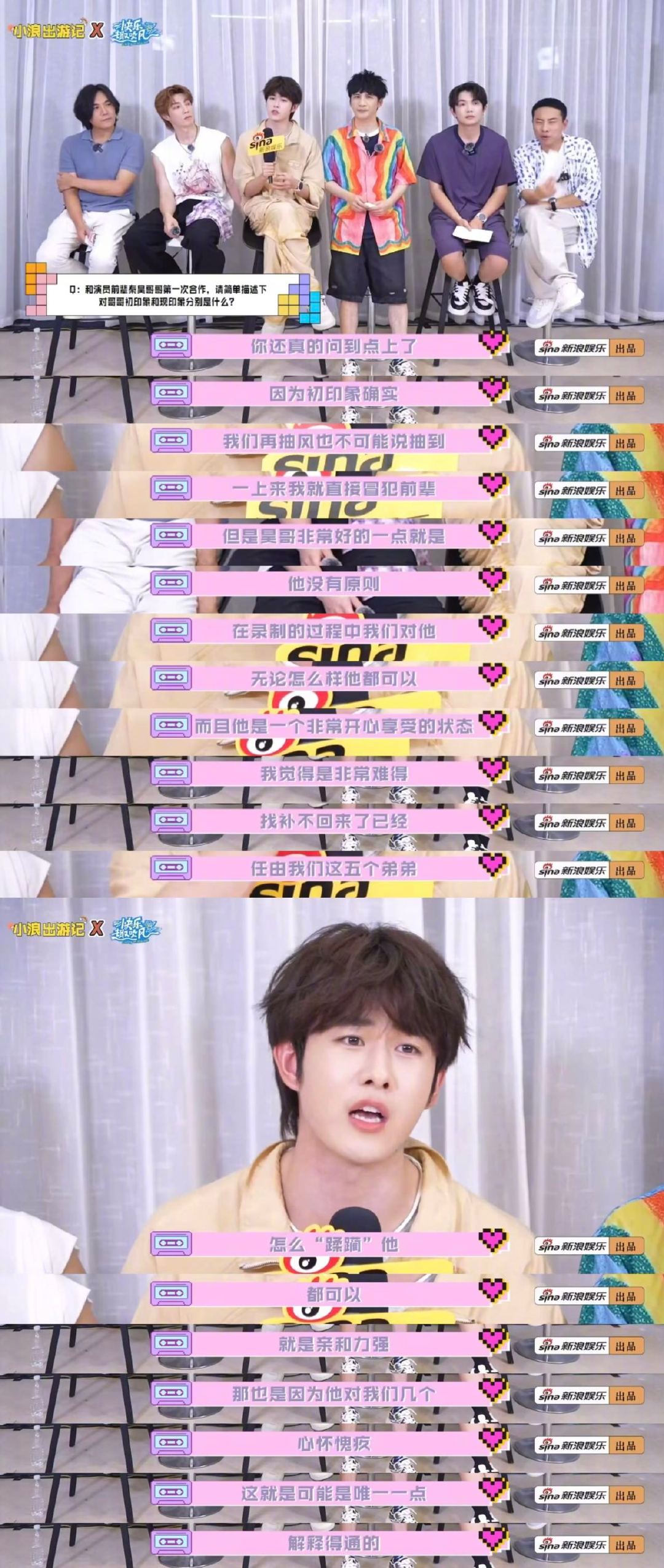 高瀚宇田嘉瑞自嘲菜鸡互啄徐志胜喊话杨超越返场对抗秦昊 新浪娱乐《小浪出游记》×《快乐趣吹风》花絮上线!不建议夏之光、董思成再来做飞行嘉宾,表示“我们几个在一起菜鸡互啄还挺开心的”,还自嘲“不然显得我们好像多笨似的”;喊话杨超越返场,称想和她组成“对抗兄妹”对抗,还聊起秦昊六年前在《极限挑战》扎破杨超越气球让她哭的过往;大张伟背梗带带颜人中吧被问“最惨睡觉地方”,主动帮回答,颜人中也表示哥哥们特别好……