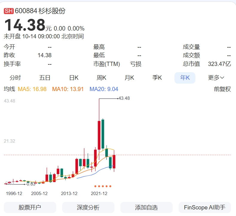 与此同时,杉杉股份2024年总营业收入为186.80亿元,同比下降2.05%;归母净利润亏损3.67亿元,同比下降147.97%。杉杉股份股票也一路下滑,从2021年12月31日的峰值43.48元/股,降至如今的14.38元/股。