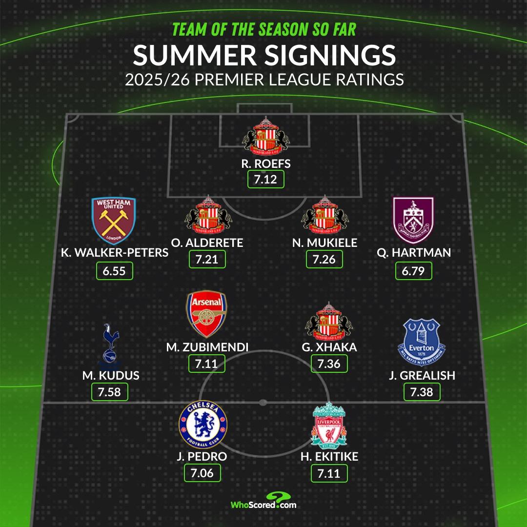 虎扑10月14日讯Whoscored盘点本赛季至今英超夏窗新援最佳阵容,埃基蒂克、苏比门迪、库杜斯、格拉利什、佩德罗等人入选。