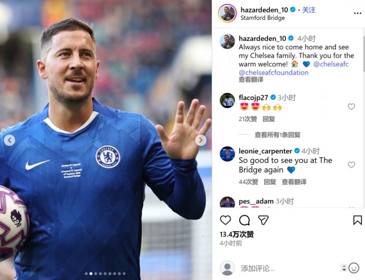阿扎尔写道:回家并见到切尔西大家庭的成员总是很开心,感谢你们的热烈欢迎!