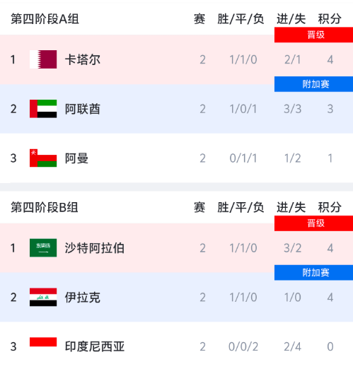 阿联酋、伊拉克获得小组第二,将进入第五阶段争夺一个参加洲际附加赛的名额。