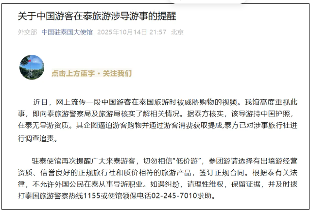 10月14日晚,中国驻泰国大使馆发布《关于中国游客在泰旅游涉导游事的提醒》: