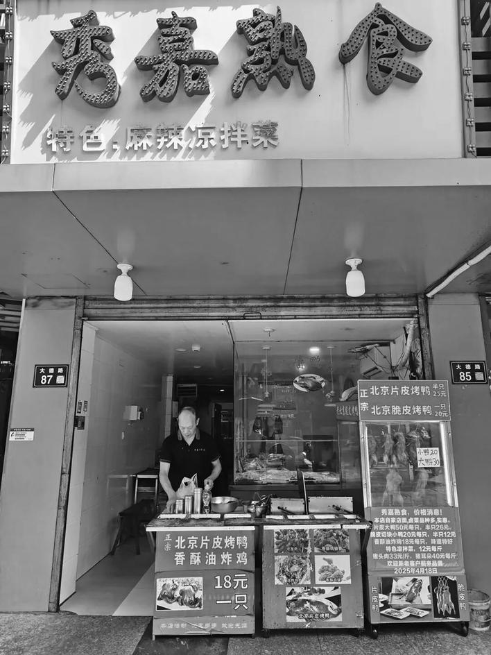 傍晚的秀嘉熟食店,玻璃柜台前已经排起长队。吴培林一边麻利地斩卤味、炸鸡腿,一边跟熟客唠嗑。额头上的汗珠混着厨房的热气,倒让那张挂着笑容的脸更显实在。