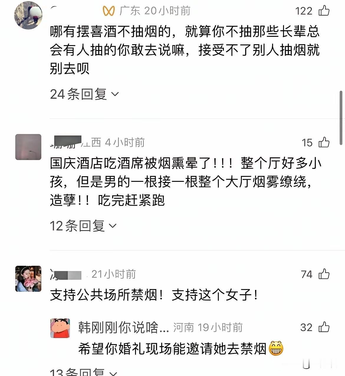 女子参加婚宴时,凭借自己个人的力量,成功把在场所有烟民暂时禁了烟。 最近云南某女子参加朋友婚礼时,看到许多人在婚礼上抽烟,该女子站出来劝说所有的烟民不要在场吸烟,因为那样非常的不健康,而且非常的不安全。因为在场不吸烟的人抽了二手烟,不利于大家的身心健康,而且当时办酒席的地方,铺满了地毯,容易着火。本来如此善意的行为,但是却遭到了不少网友的网暴,部分网友认为该女子多管闲事,你就是一个前来喝酒的亲朋好友而已,你有什么资格去制止其他人抽烟,真是不知天高地厚,自不量力。 对于女子的行为,大家是怎么看的呢?其实个人认为女子的行为值得点赞,毕竟非常有安全意识和健康意识,虽然她无权去指责别人抽烟,但是为了大家的安全和健康,她勇敢的站了出来,这个值得肯定。