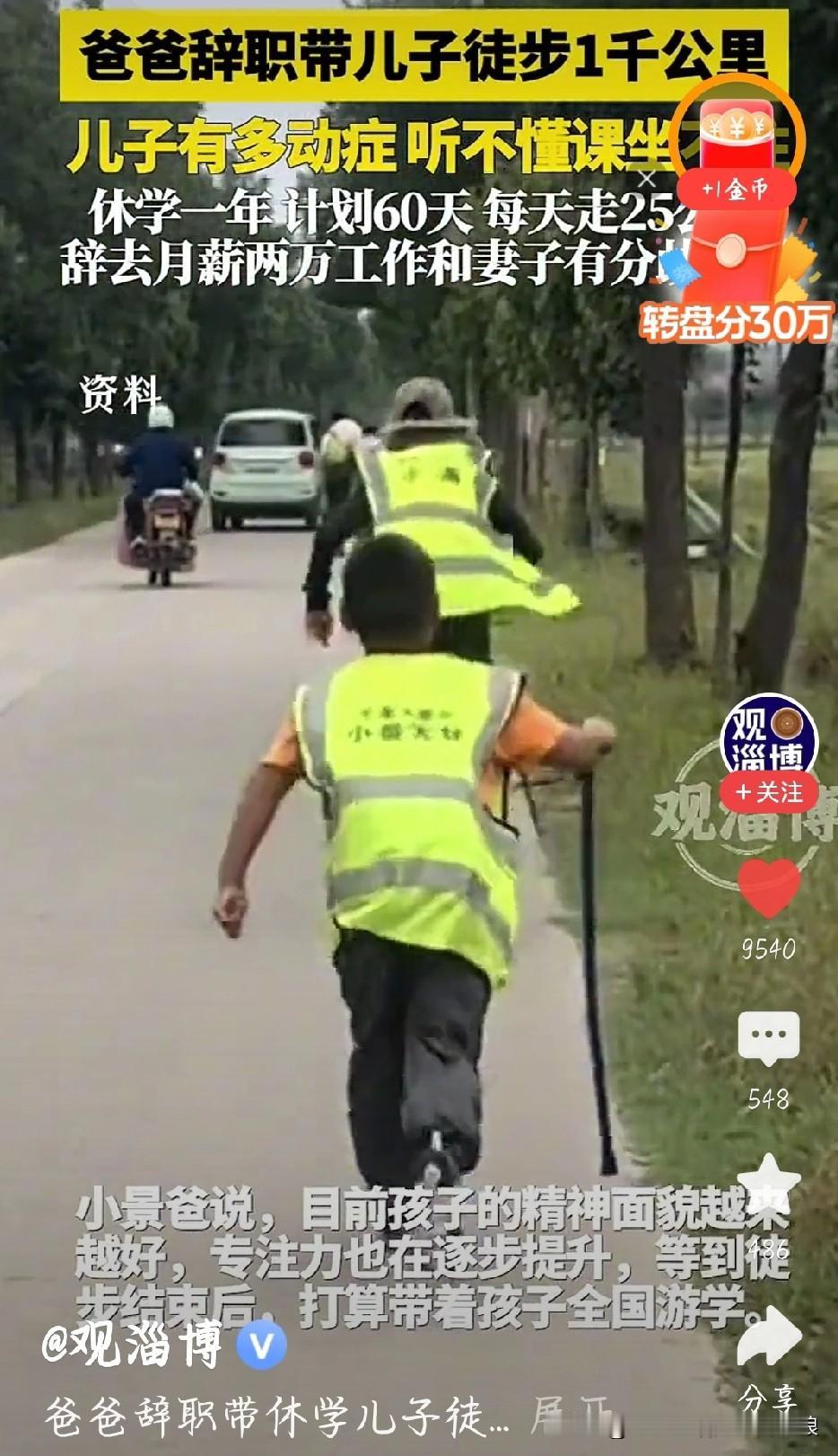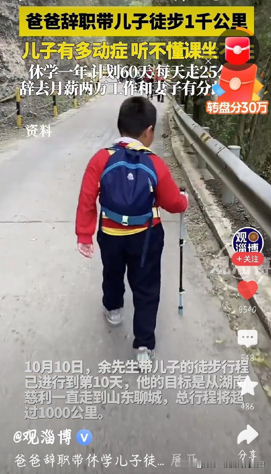 湖北余大哥的选择,戳中太多人的心。儿子9岁患多动症,上课坐不住、听不懂,他干脆辞了月薪两万的工作,带休学的娃从湖南徒步去山东,要走1000公里。 有人骂博流量,说会把孩子腿走废。可他不管,每天带娃走25公里,3公里就设个补给站。累了就歇,闹情绪就哄,还带着另外两家娃同行练社交。 现在14天了,娃晒黑了却眼里有光,以前走几步就哭,现在全程能扛。路上还会给拾荒老人送吃的,懂了体谅人。 哪是徒步?这是爸爸用脚步给娃铺的成长路啊!爸爸回应辞职带休学儿子徒步千里 徒步 多动症 伟大的父亲 图片截图于于观淄博