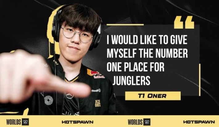 Q:我一直在询问本届全球总决赛的选手们心中的前五名选手,但想给Oner增加挑战性,只让你说出心目中最强的打野选手。当然如果愿意的话也可以报自己的名字。