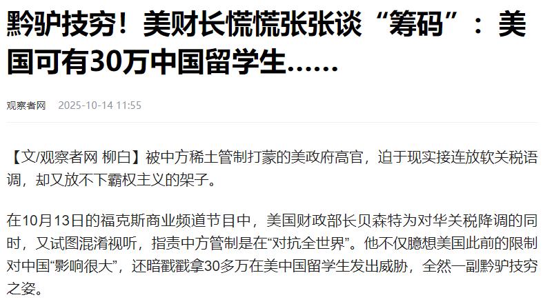 没办法打破我们的稀土管制,贝森特又抛出“留学生”的“筹码”! 当地时间10月13日,美国财长贝森特在接受福克斯商业频道采访时,居然暗示如果中国不撤销稀土出口管制新规,就要驱逐在美境内的数万中国留学生,甚至还要在软件、金融等领域搞进一步动作。 我们实施稀土出口管制,本就是基于资源保护和生态环保的正当举措,符合世界贸易组织规则和国际通行惯例,这是主权国家的合法权利,轮不到美国指手画脚。 可贝森特倒好,眼看在稀土问题上没占到便宜,就想出威胁驱逐中国留学生这种不光彩的招数,实在是让人不齿。 要知道,30多万在美中国留学生,可不是美国想拿捏就能拿捏的。这些留学生不仅为美国高校带来了源源不断的人才活力,更在经济层面做出了巨大贡献。 他们每年支付的高额学费、日常生活消费,都是美国教育产业和相关服务业的重要收入来源,直接支撑了众多高校的运营和周边商业的发展。就拿美国高校来说,国际学生的学费通常比本土学生高不少,中国留学生群体更是其中的重要组成部分。 要是真把这些留学生驱逐了,美国高校会面临学费收入锐减、科研团队人才流失等问题,相关的餐饮、住宿、零售行业也会跟着受影响,受损的只会是美国自己的利益,这种损人不利己的事,也就只有急昏了头的人才做得出来。 贝森特还臆想美国此前的限制对中国“影响很大”,这可真是自欺欺人。 看看之前美国搞的芯片禁令,从2018年就开始针对中国科技企业,又是禁止供应零部件,又是限制高端设备出口,结果不仅没能遏制我们的发展,反而倒逼我们加快了自主研发的步伐。 华为在制裁下推出了搭载麒麟9000S芯片的Mate60 Pro,中芯国际实现了14纳米工艺的稳定量产,这些都是中国科技企业突破封锁的最好证明。 现在美国又想故技重施拿稀土和留学生说事,显然是没吸取教训。中国在稀土领域拥有从开采、冶炼到加工的完整产业链,全球大部分稀土加工产能都在中国手中,早就做好了应对各种挑战的准备,美国的这些威胁根本吓不倒中国。 我外交部明确表示,美方应停止将经贸科技问题政治化、工具化,停止搞胁迫外交。稀土管制是中国维护国家利益的正当手段,而留学生交流本是中美两国人民之间的友好纽带,促进着两国的文化交流和民间互信。美方把留学生当作“人质”来进行威胁,不仅严重违背了国际道义和人文精神,也会让更多人看清这种做法的霸道本质。 说到底,中美之间的分歧从来都不是靠威胁和施压能解决的,平等对话和协商才是正道。贝森特这种拿留学生当筹码的做法,只会进一步破坏中美之间本就脆弱的互信,对两国关系的发展毫无益处。 我们从来不会被任何外部压力所屈服,在维护国家核心利益的问题上,我们始终立场坚定、寸步不让。美方与其白费力气搞这些没用的威胁,不如好好想想如何理性看待中国的发展,如何通过合作实现共赢。 毕竟,在全球化的今天,各国利益早已紧密相连,搞对抗只会两败俱伤,只有坐下来以理性务实的态度与中方沟通,才是解决问题的正确选择。