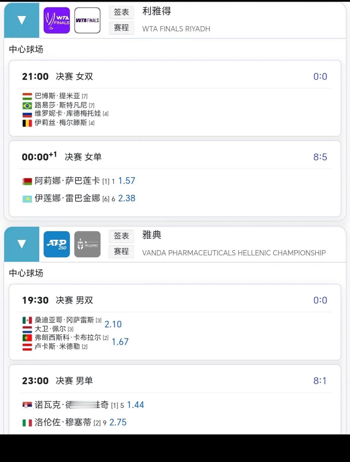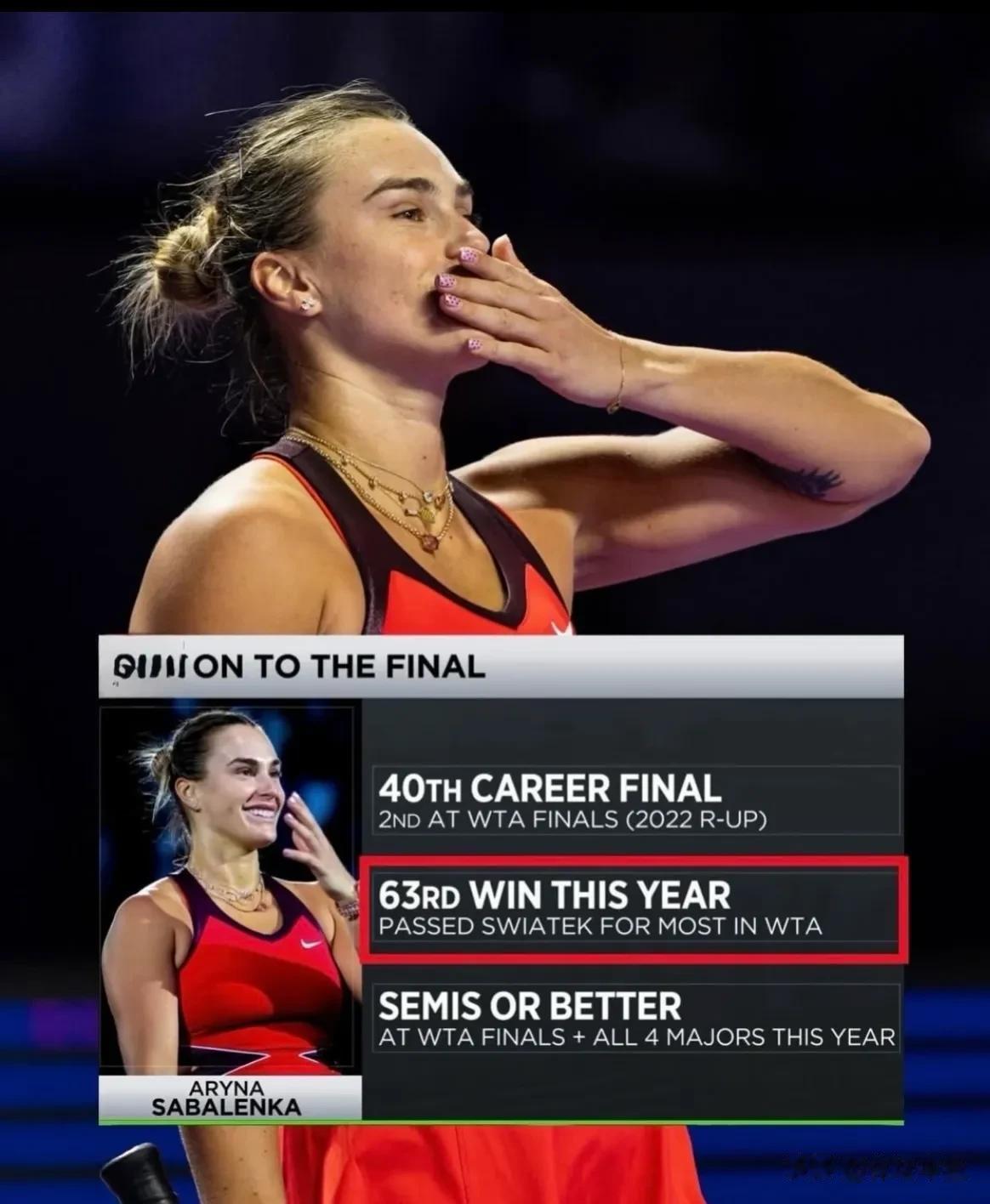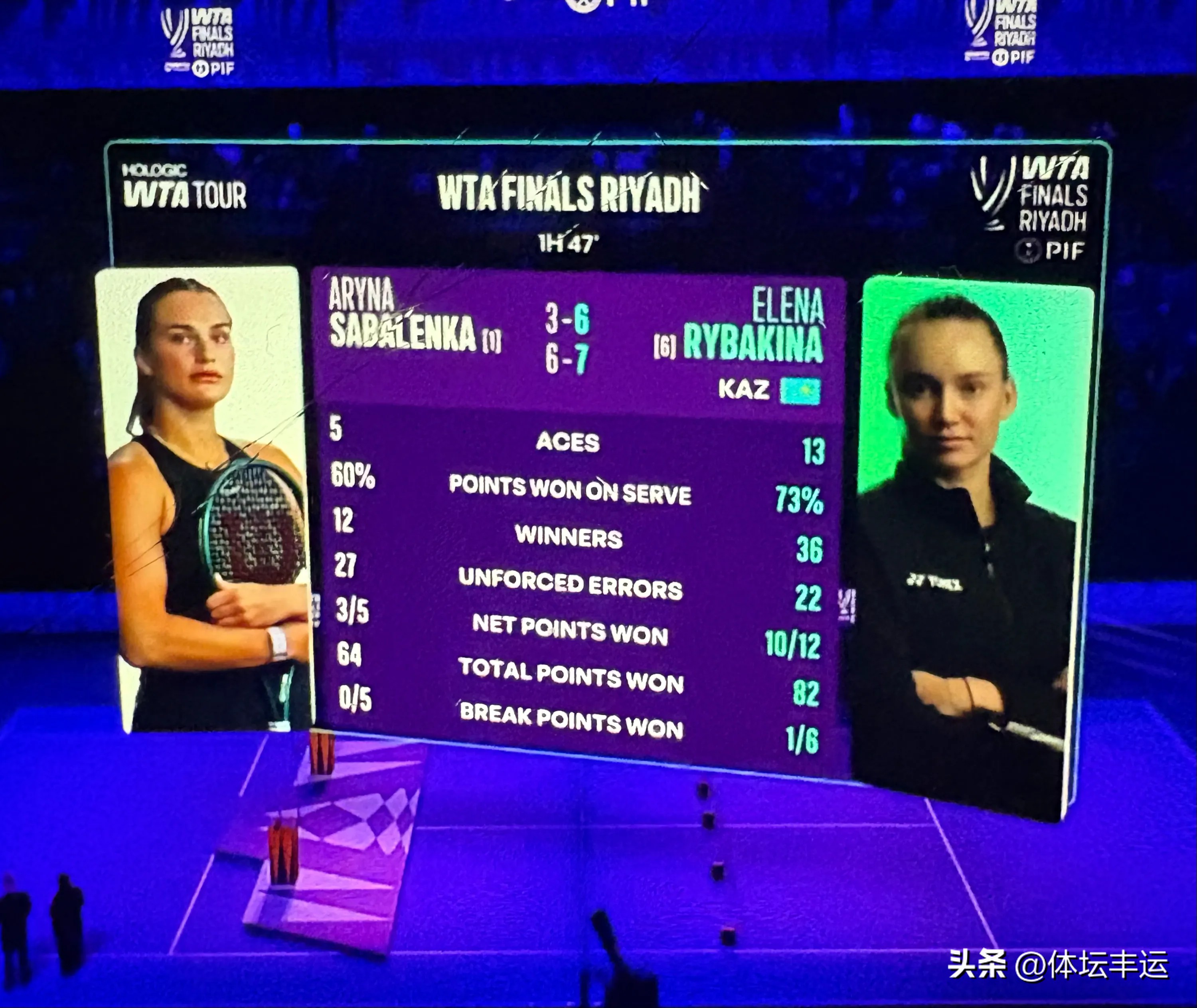 利雅得WTA年终总决赛女单决赛,头号种子白俄罗斯萨巴伦卡vs6号种子哈萨克斯坦莱巴金娜!历史交手记录:萨巴伦卡8-5莱巴金娜!✅首盘耗时45分钟,