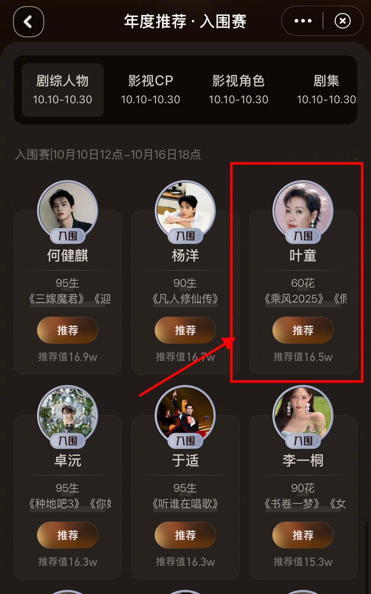 叶童601 以热忱与专注完美诠释了何为“超长待机”的演员生命力。登顶首位推荐值破10万的“60后”,叶童实至名归!微博视界大会