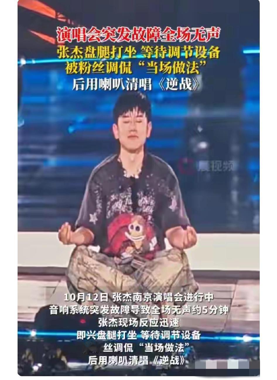 突发故障,张杰南京演唱会的“打坐”,造就了“神仙救场”名场面 张杰南京演唱会中途设备故障,千百人现场齐唱《逆战》,气氛热烈! 张杰在南京举行的“未・LIVE”巡回演唱会,10月10日至12日共三场,10月11日那场演出中,发生了舞台设备故障。 音响突然失灵,灯光也熄灭,现场一度陷入一片寂静。 据现场观众描述,张杰当时“反应超级快”,立即盘腿坐下,调节现场气氛。 随后,张杰拿起手持小喇叭,对着空旷的场地清唱了一曲《逆战》,并引导观众用心跟着齐唱,场面十分磅礴,气氛也变得热烈起来。 过了不久,舞台音响恢复正常,灯光也亮了起来。张杰则无缝衔接,接着演唱其他曲目,演出未受到太大影响。 观众相继发帖称赞张杰应对能力超赞,也表示这场演唱会办得很过瘾。 截至10月12日中午11点,这场演唱会在社交平台上的热度已突破5亿,话题阅读量也超过5亿次! 张杰南京演唱会主办方10月13日也发出声明,对舞台设备故障表示歉意,并承诺下次改进。 但现场观众称,他们并没有怪责主办方的意思。表示:“发生这样的事情,谁都不想遇到,但确实发生了,杰哥也很完美地化解了这个小插曲,我们都看得很过瘾,很开心。” 还有人说:“没想到不仅听到了喜欢的歌曲,还见证了杰哥的专业素养。” 对此,您怎么看?欢迎在评论区留言!